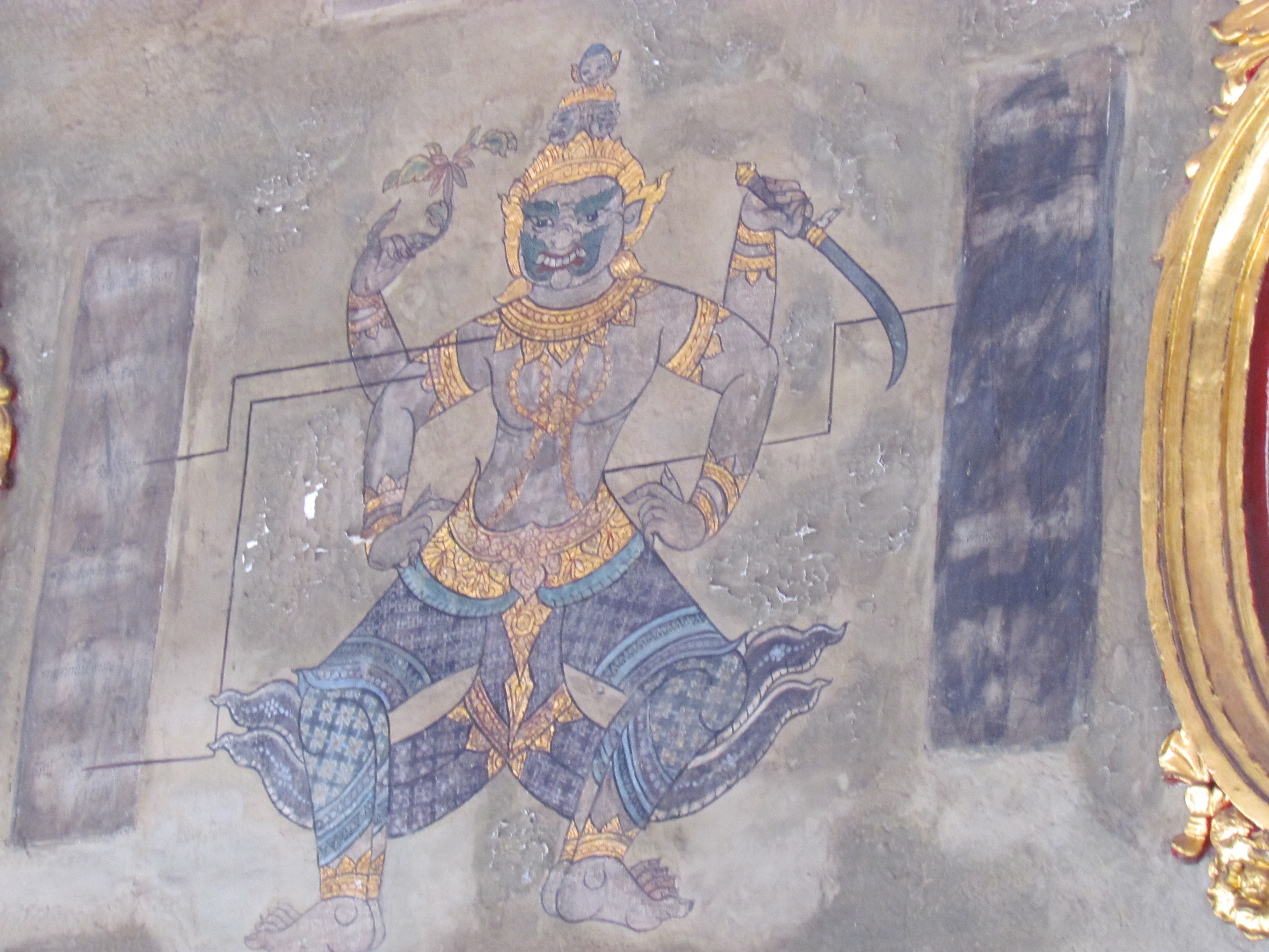 All round the Reclining Buddha are murals depicting the life of Buddha. This is just a small part of one of the scenes, partly picked out in gold leaf: