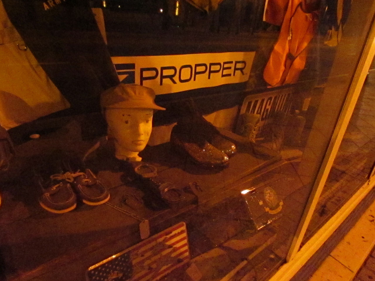 As the night grows darker, the display in an army surplus store is evocative of other worlds: