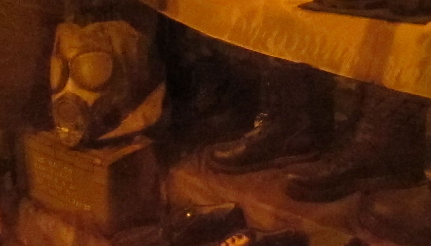 A gas mask in the next window sends a shudder up this worm’s spine. (And my spine is not stiff, even at the best of times.)