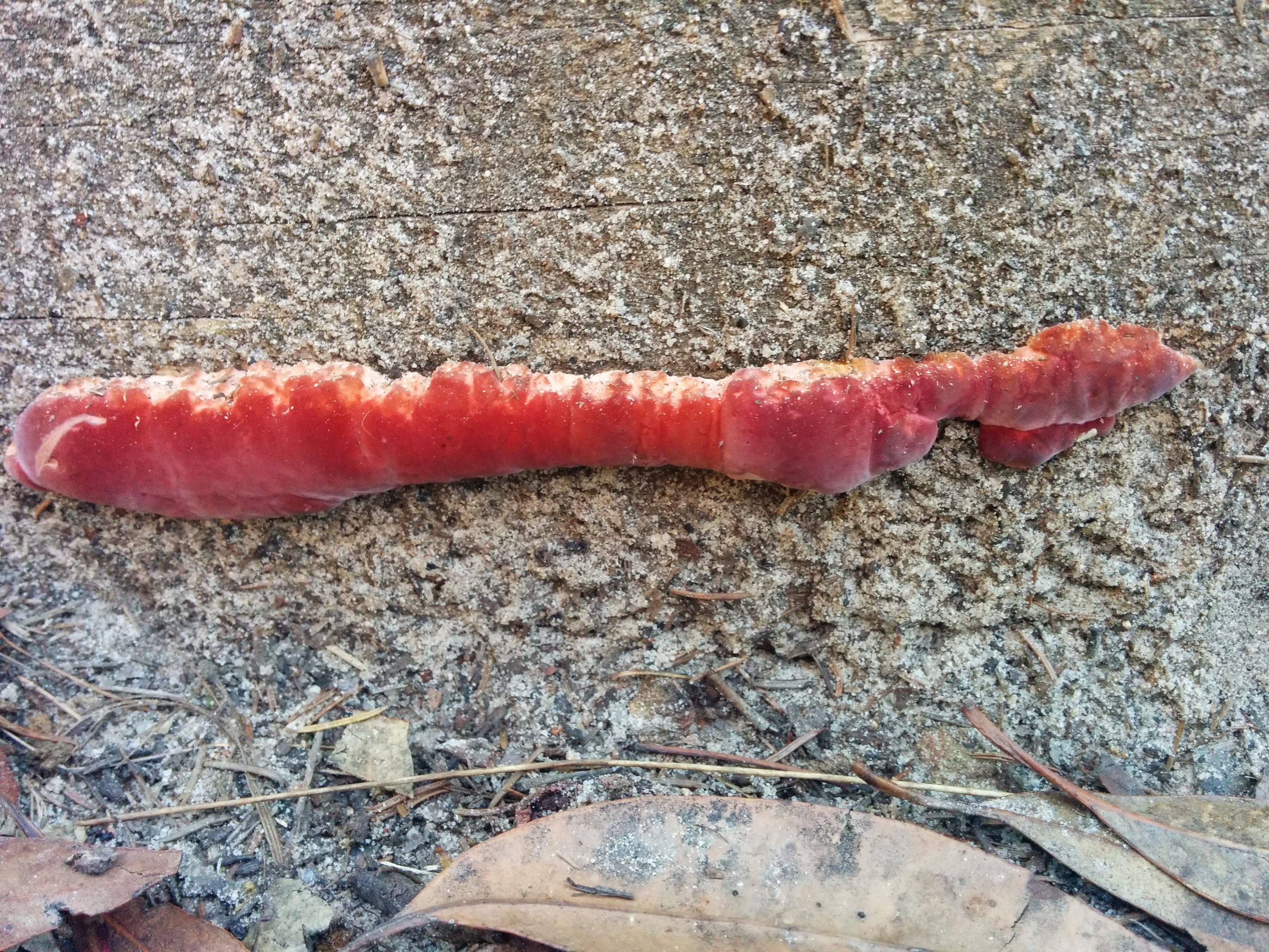 It’s quite long, perhaps 10 to 12 centimetres – compare it with the gum tree leaves also visible in the photo. It’s red with pale cream extrusions at the edges. It’s attached to the vertical face of a step. It didn’t move, even when the TC prodded it gently with a stick.