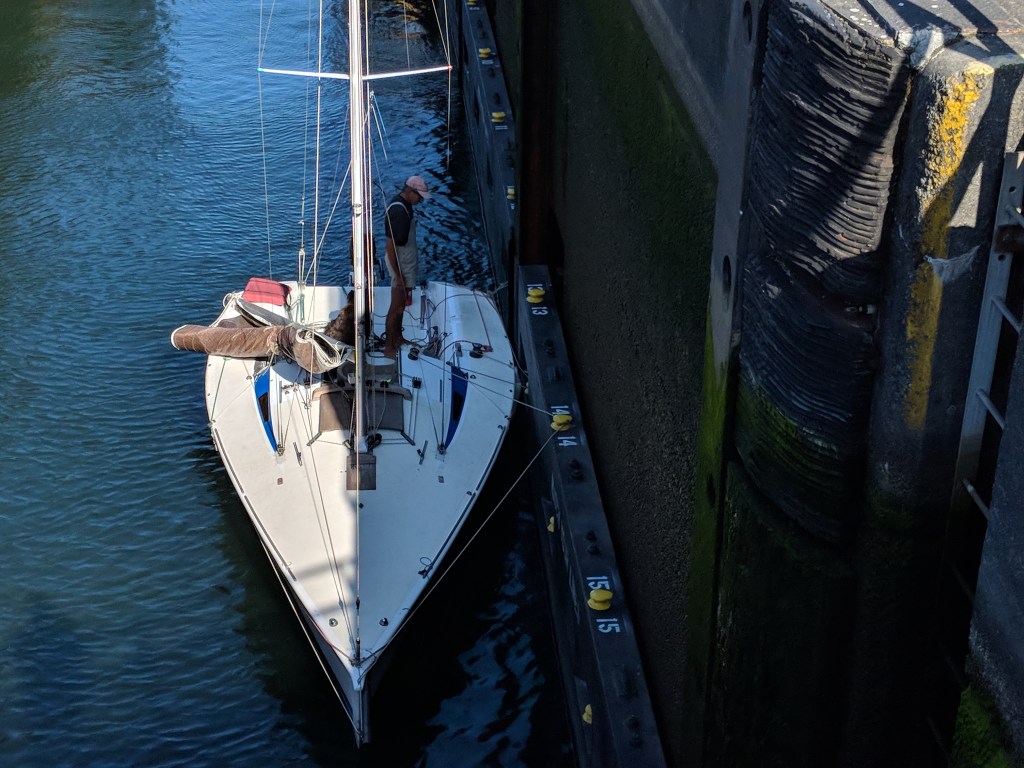 Here are a sailing boat and a dinghy entering the locks from the direction of Puget Sound, wanting to jump vertically upwards by a few metres into the canal. There’s a dog accompanying the sailor on the yacht: