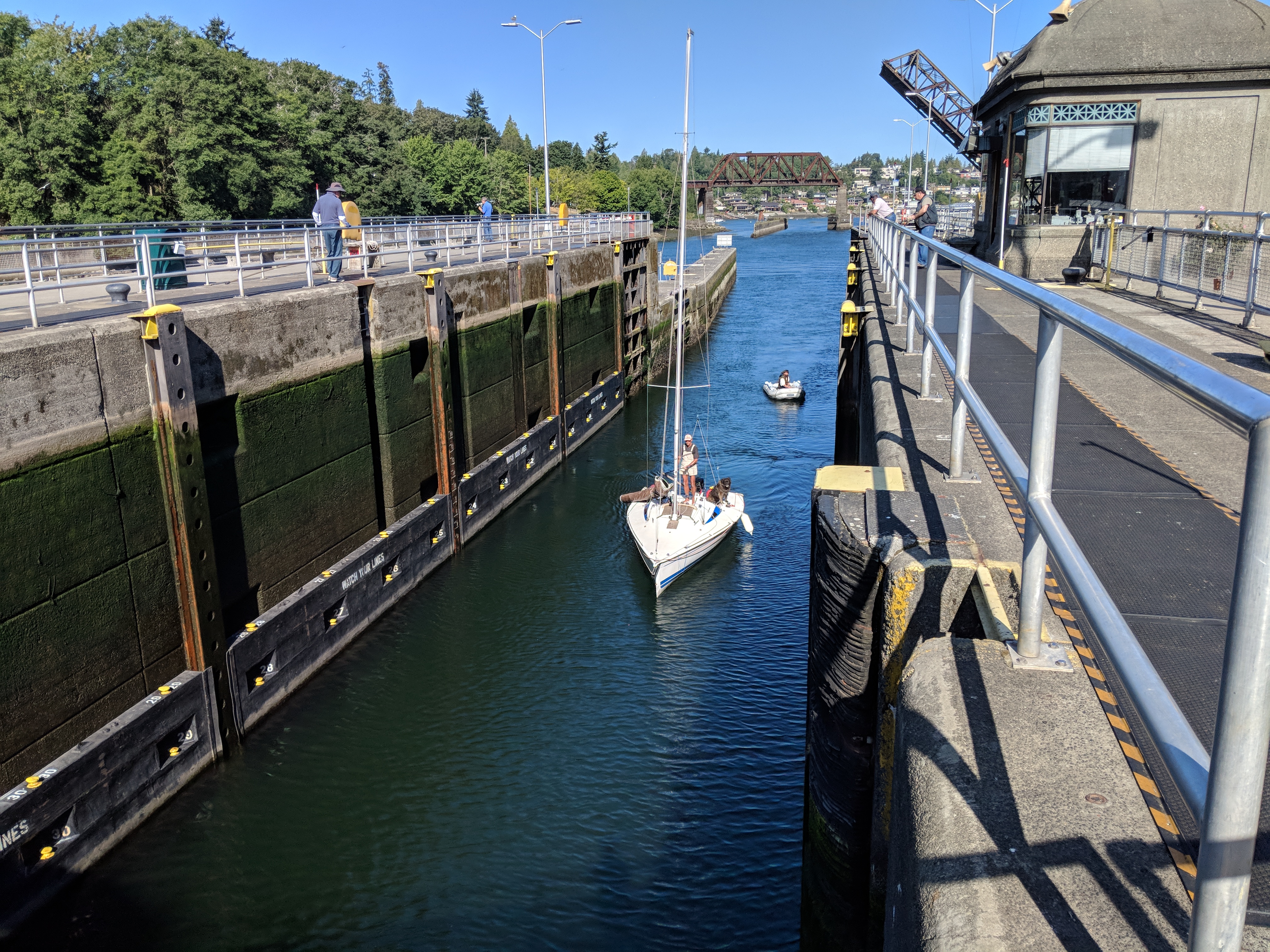 Here are a sailing boat and a dinghy entering the locks from the direction of Puget Sound, wanting to jump vertically upwards by a few metres into the canal. There’s a dog accompanying the sailor on the yacht: