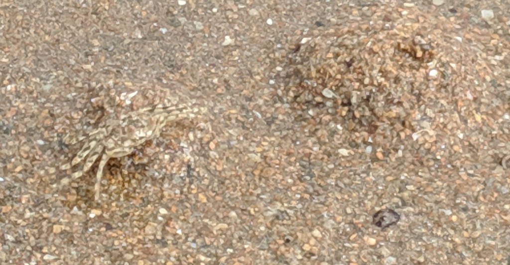 Denizens of the beach included super-fast, nigh-invisible crabs. In the following picture, the crab is on the left. At top right is a mound with a hole in it, probably the entrance to a crab palace: