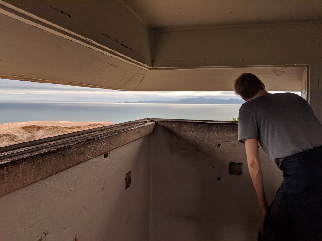 To get to the lookout, we climbed a series of stone steps and metal ladders. The TC did a good job, even hopping up onto the final platform inside the top room to see the view through the plane/ship-spotters slot in the wall. This shot shows an equally bold fellow traveller gazing out through the slot: