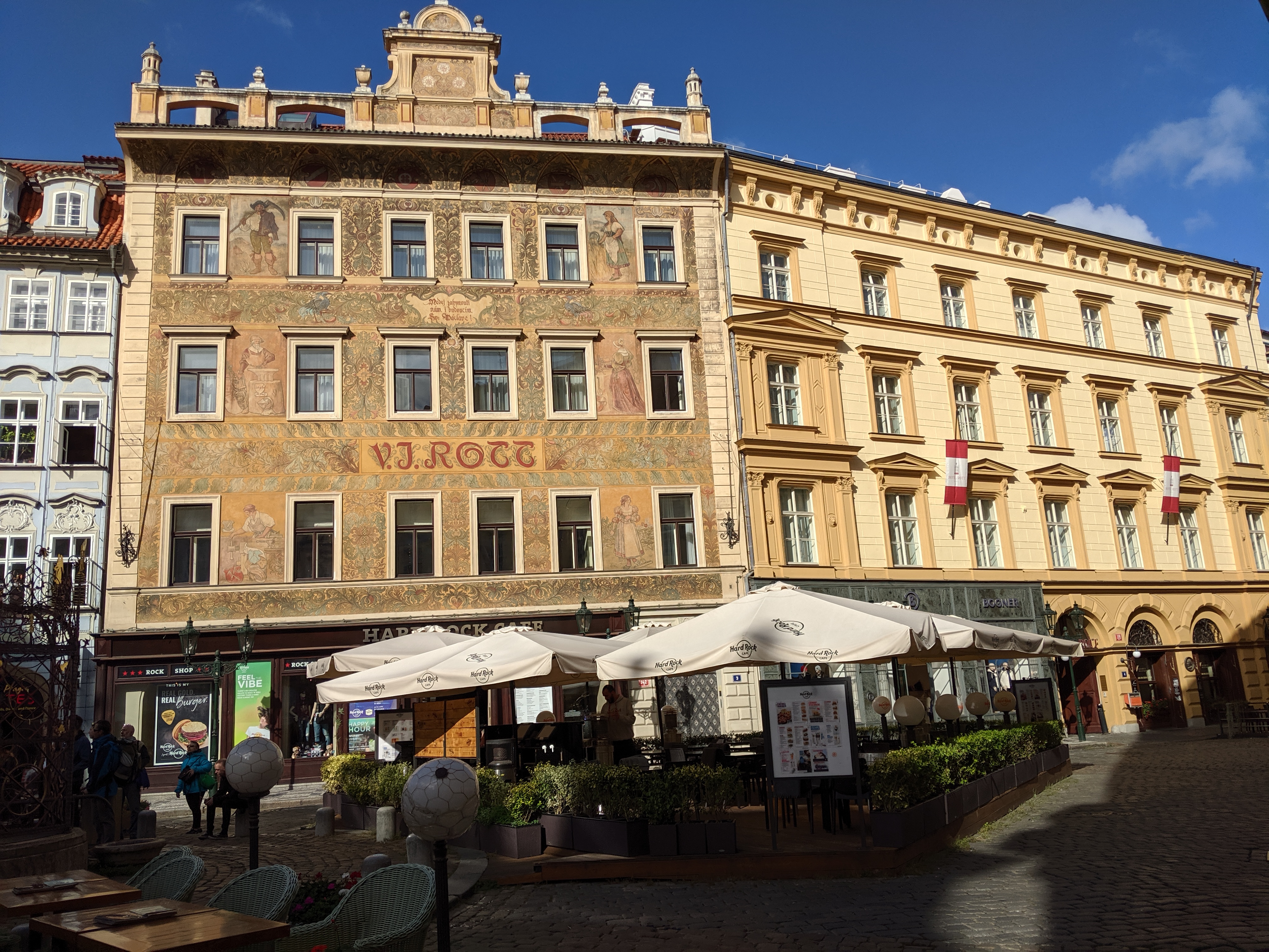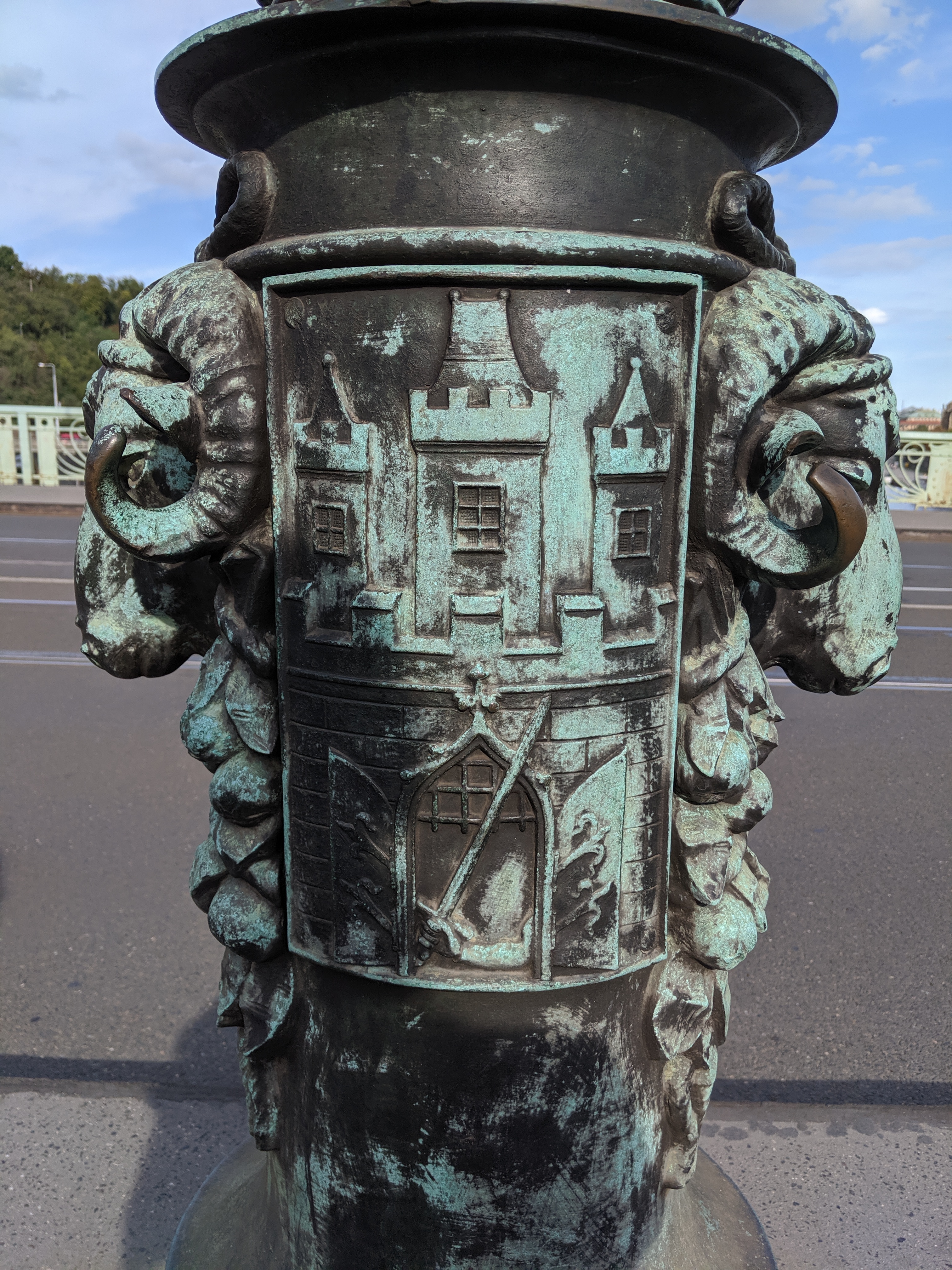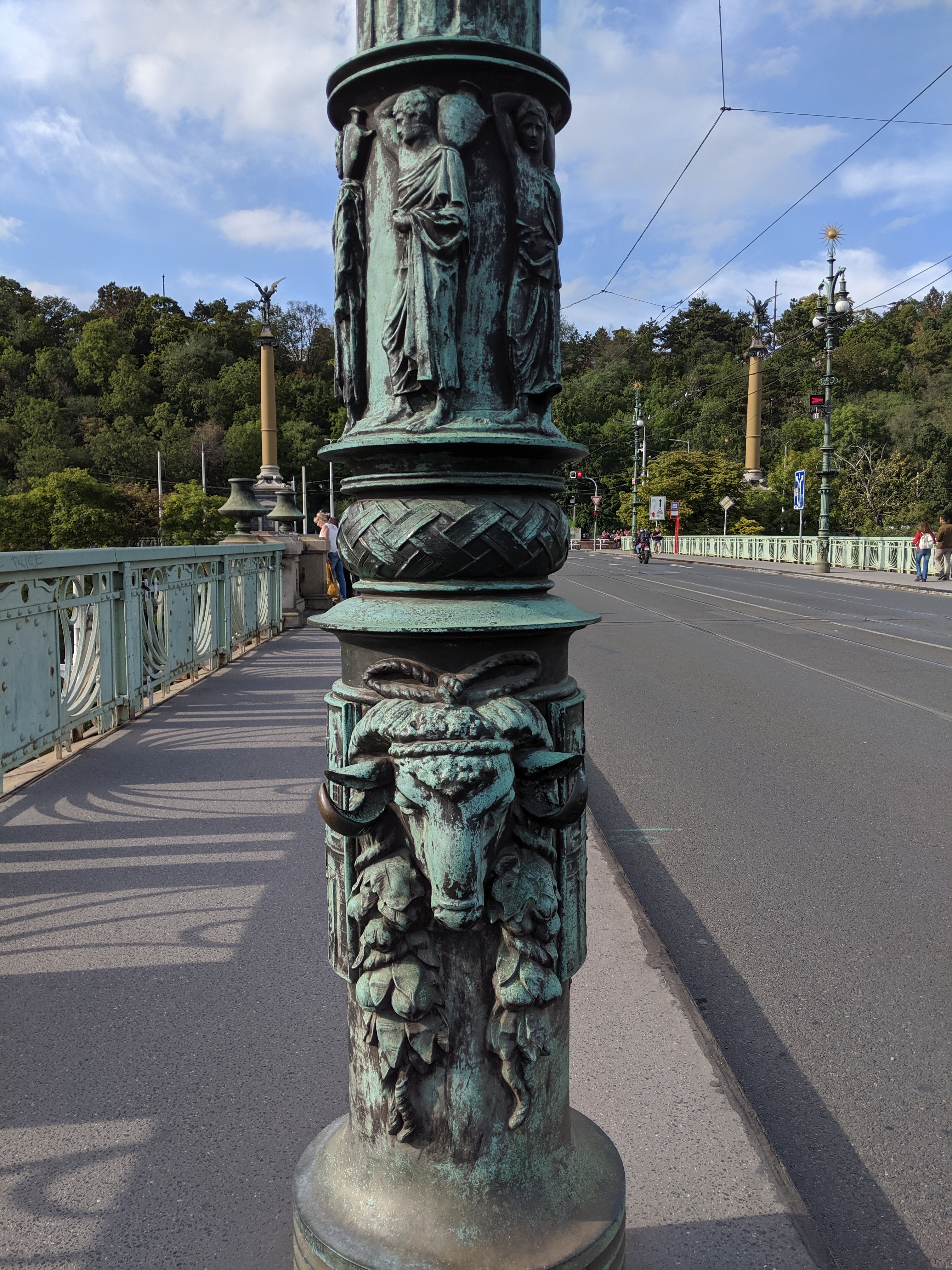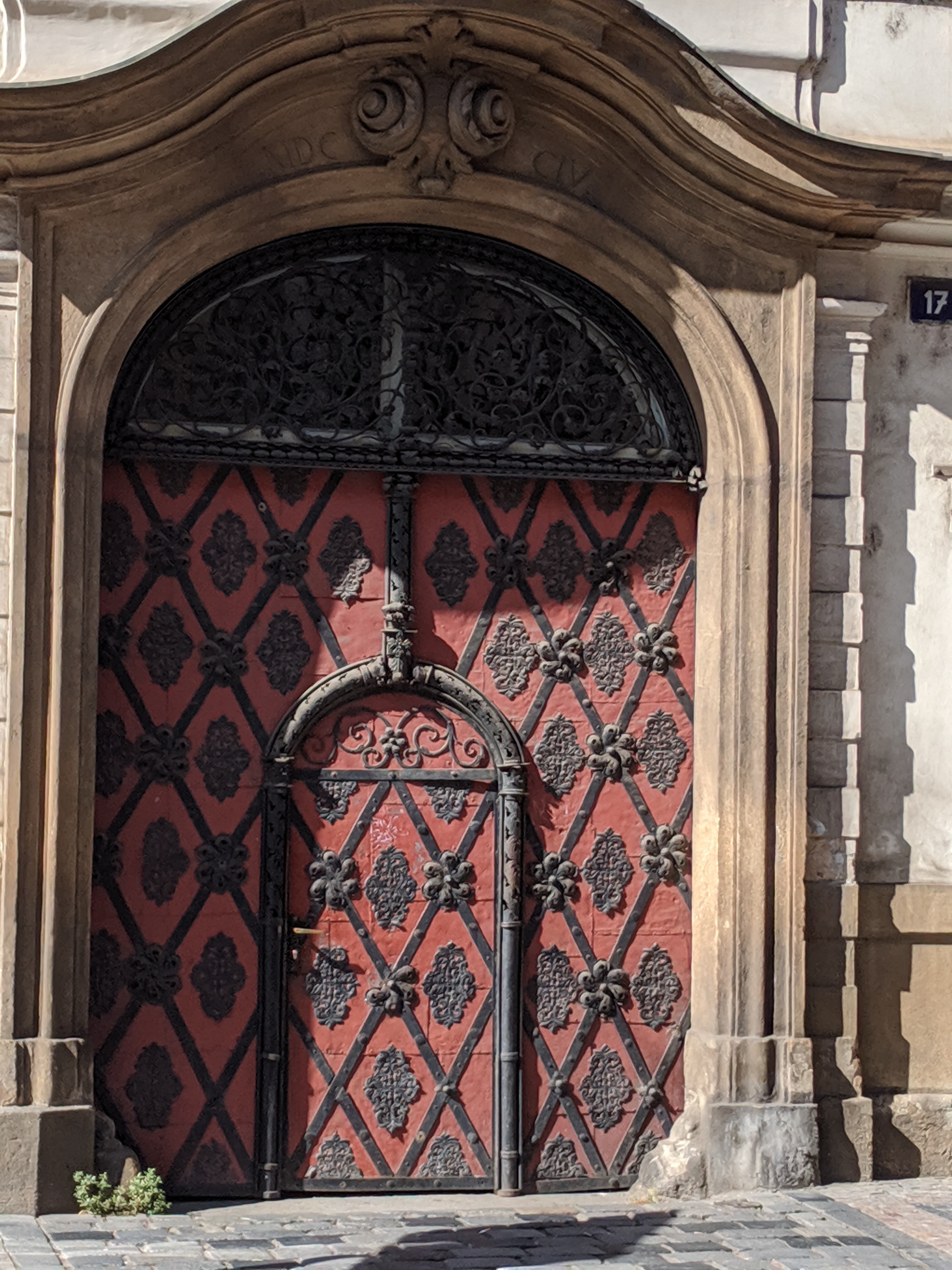 Prague is a city of patterns. In particular for a personage like your faithful worm, who spends much time significantly near the ground, the paving stones are a source of pleasure. Ornate doorways, stamped lamp posts, and patterned walls add to the local colour.