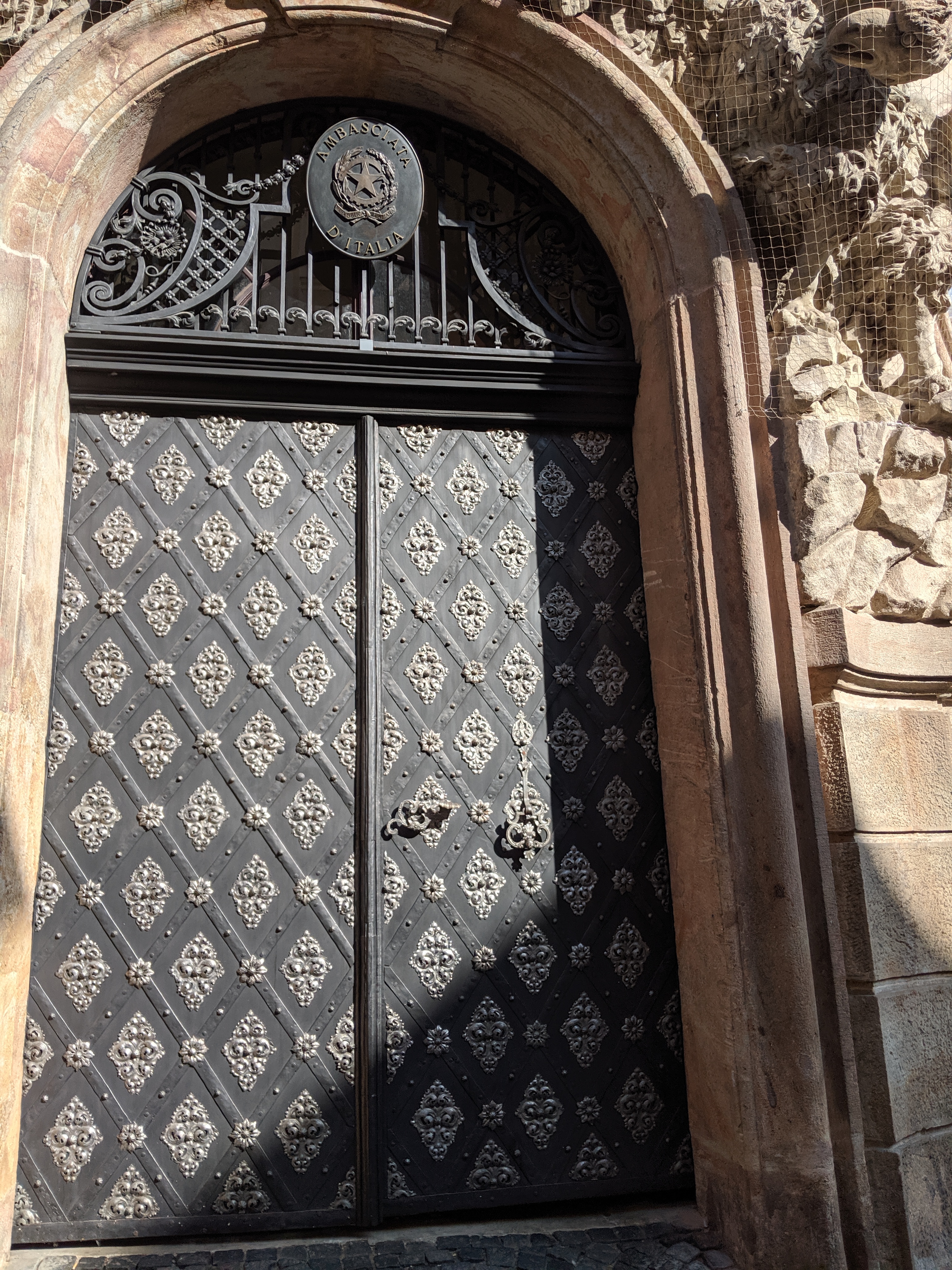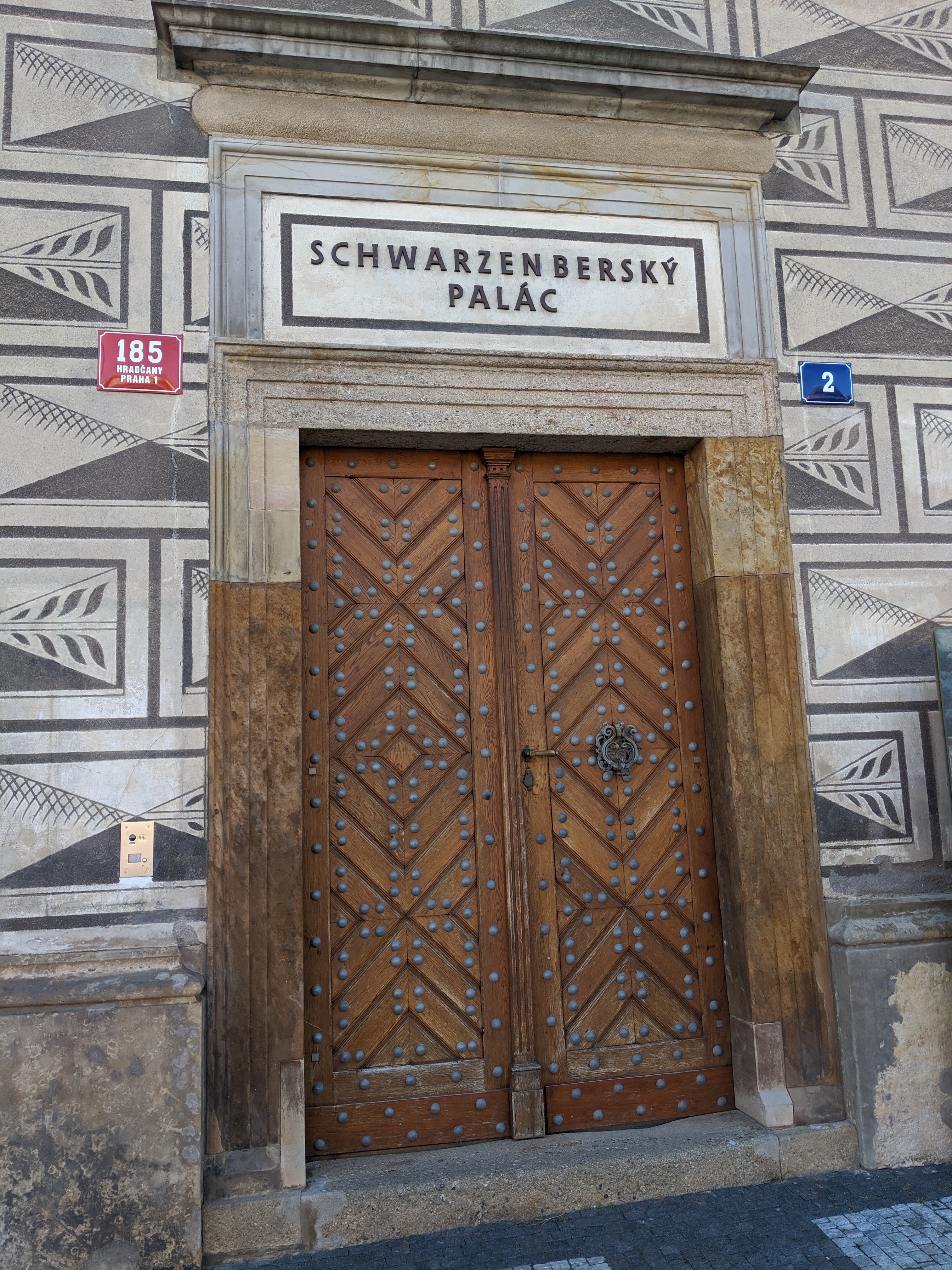 When doorways don’t suffice, people decorate entire buildings. The next picture shows me up against a Renaissance sgraffito panel on the facade of the Schwarzenberg Palace: