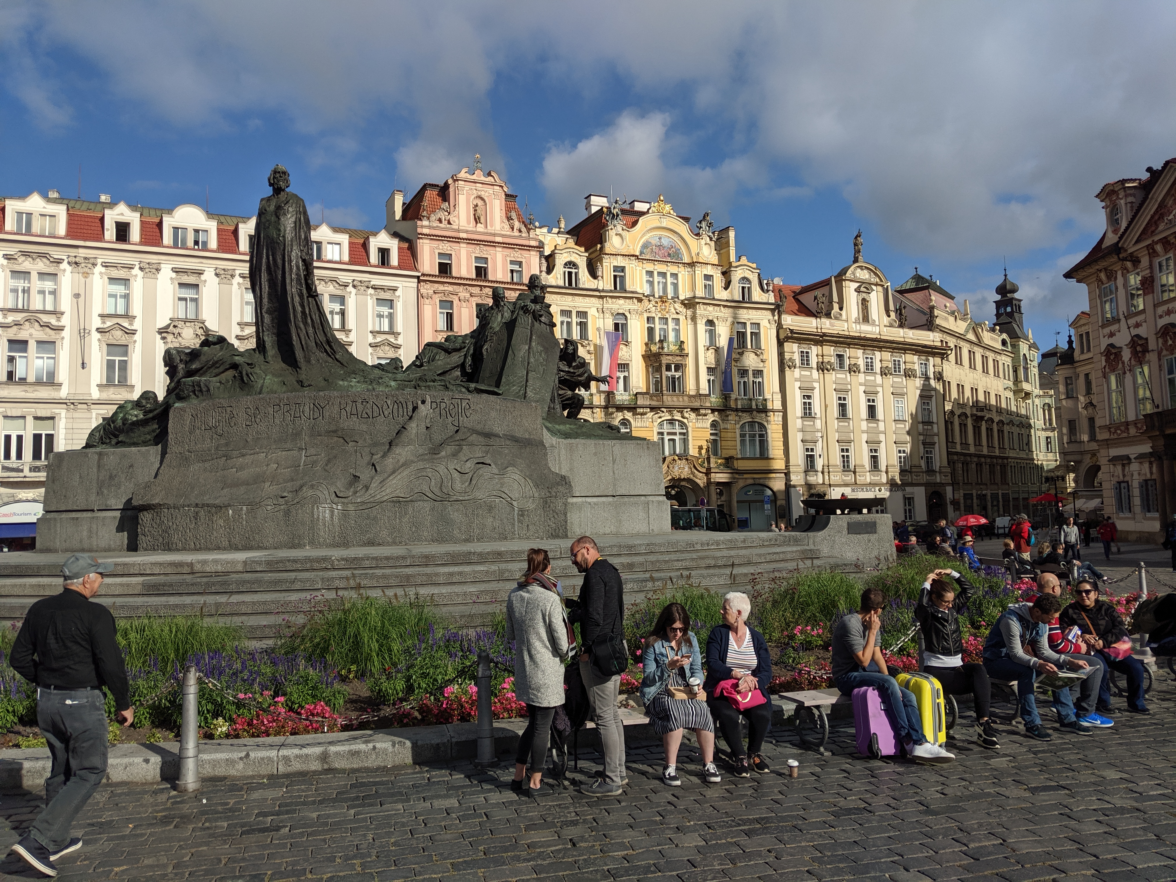 The Old Town Square in Prague is more than a thousand years old. It started out as a marketplace in the tenth century. In the centre of the square is a statue of a Czech theologian, Jan Hus, erected in 1915 to commemorate the 500th anniversary of his death. He was burned at the stake in 1415 as punishment for his reformist beliefs: