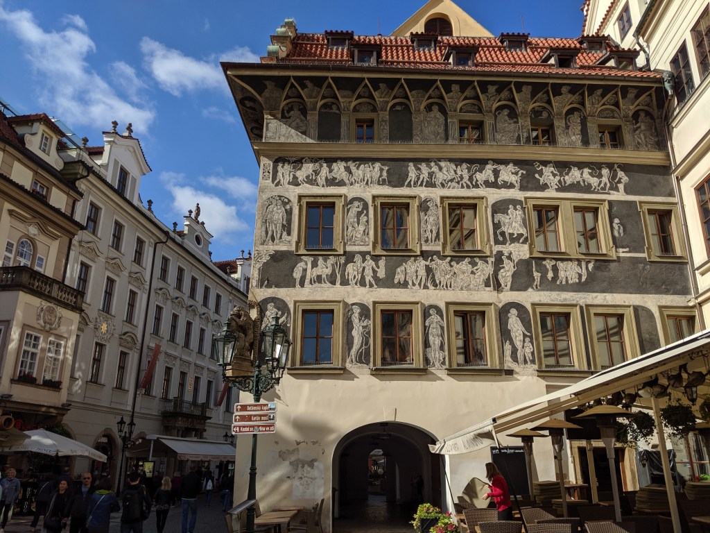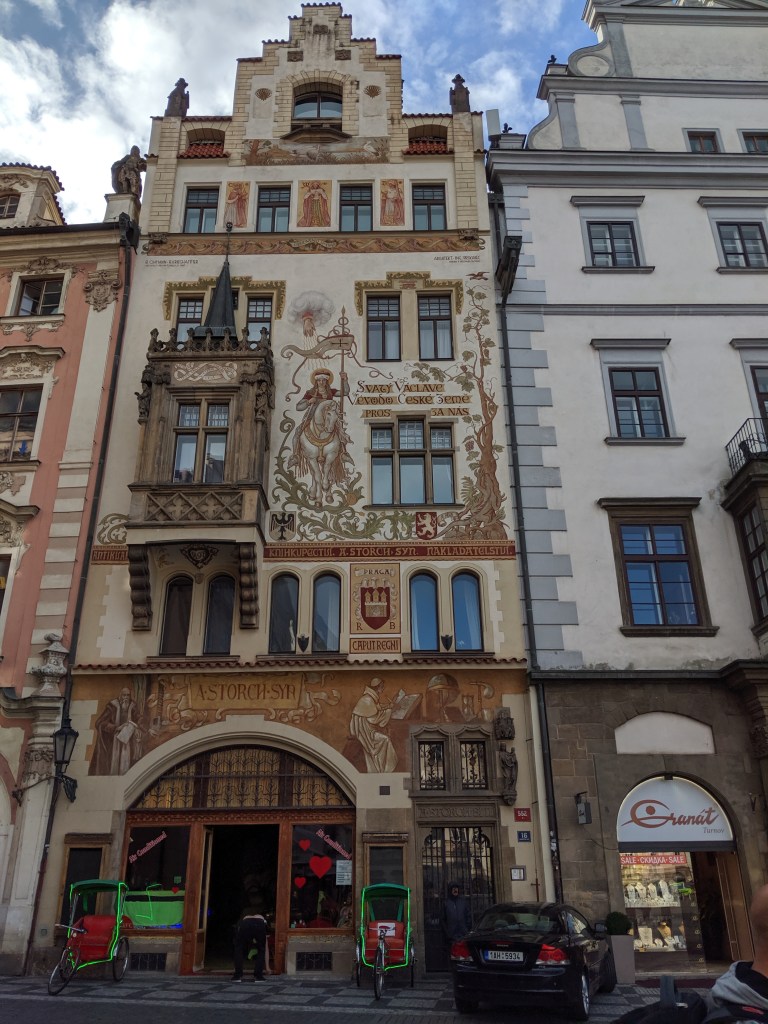 In the same area is Štorch House, built in the Gothic style in the fifteenth century, and redecorated in the neo-Renaissance style in 1897. The painting on the front is etched into the wall, showing St Wenceslas, patron saint of Bohemia:
