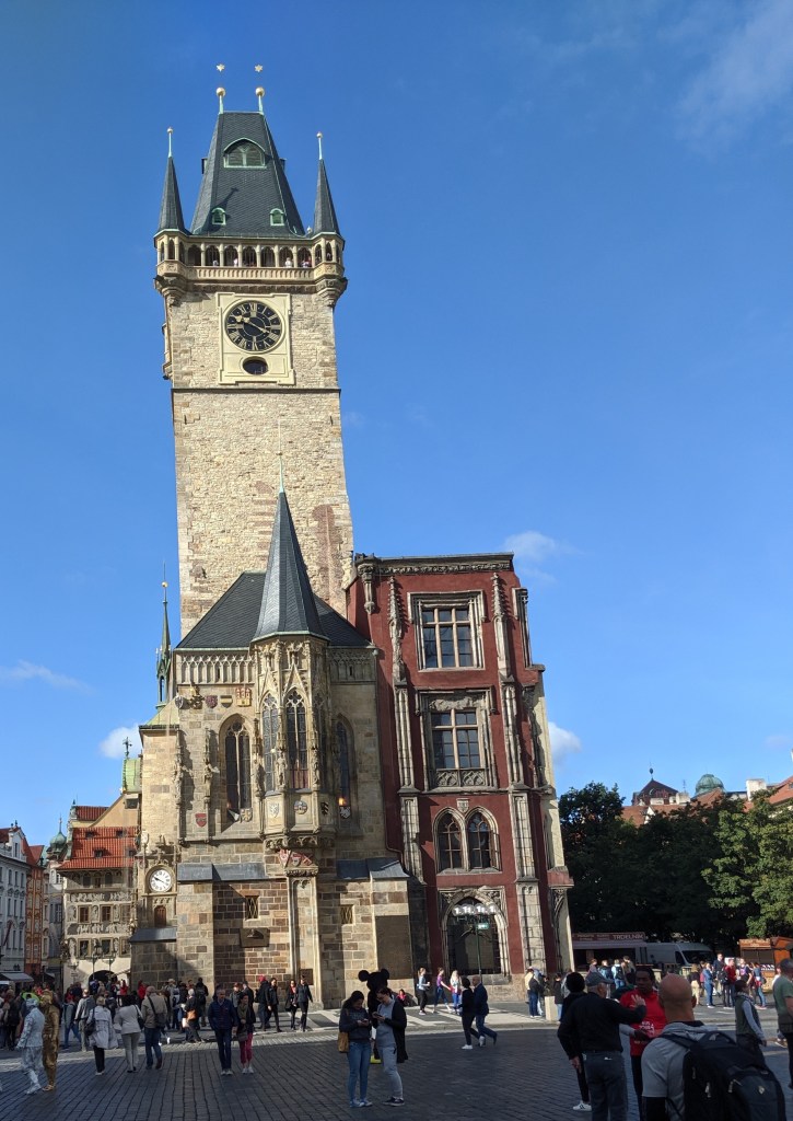 Me and the TC dropped in on the Old Town Square in Prague. The square is a cobbled area surrounded by gorgeous buildings. The feeling is more open than many town squares in Europe. Grandeur and antiquity are there to see, but are not overpowering.