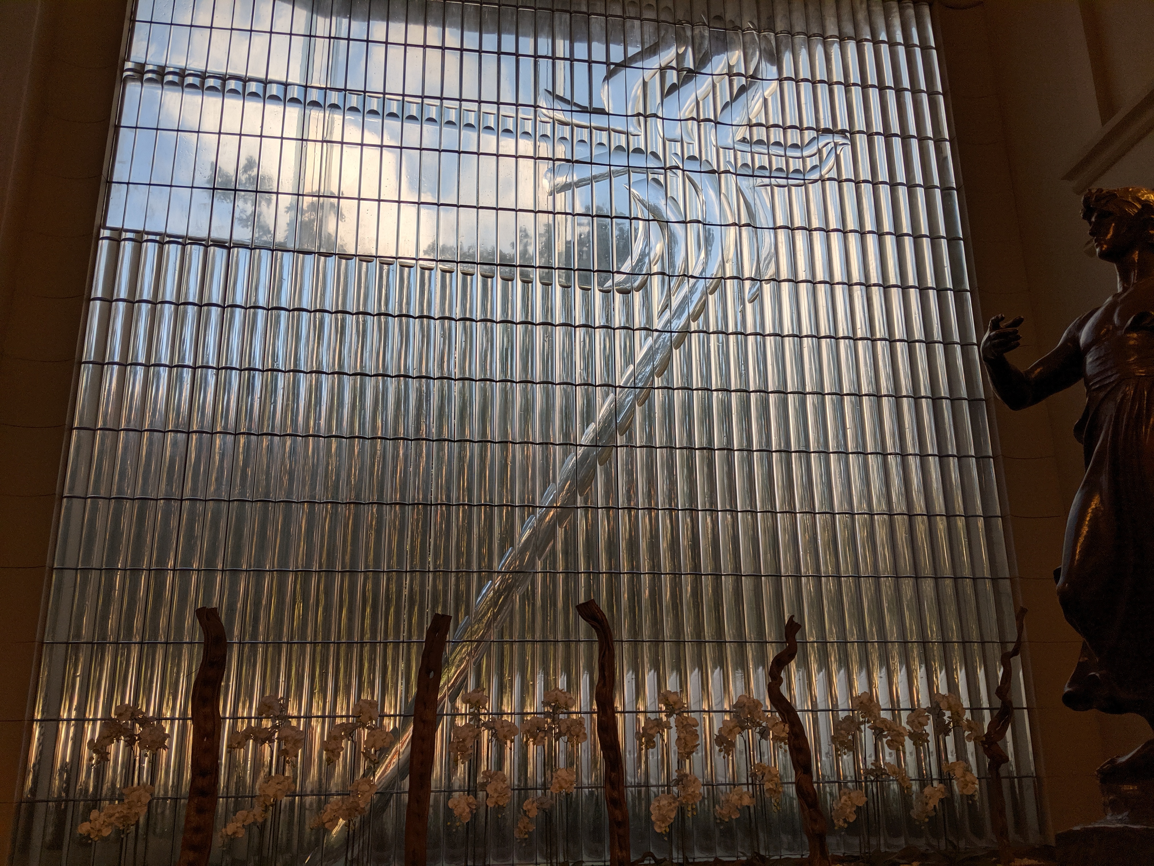 As I mentioned earlier, most of one wing of the town hall was destroyed during the Second World War. Below is a shot of the large window that covers the gap where the rest of the building used to be. What does the image on the window look like to you, dear reader? This worm saw it as a palm tree blown by the wind, Hawaii style. It’s more likely to be a flower, as there are very few palm trees in Prague. I couldn’t find any information about this window: