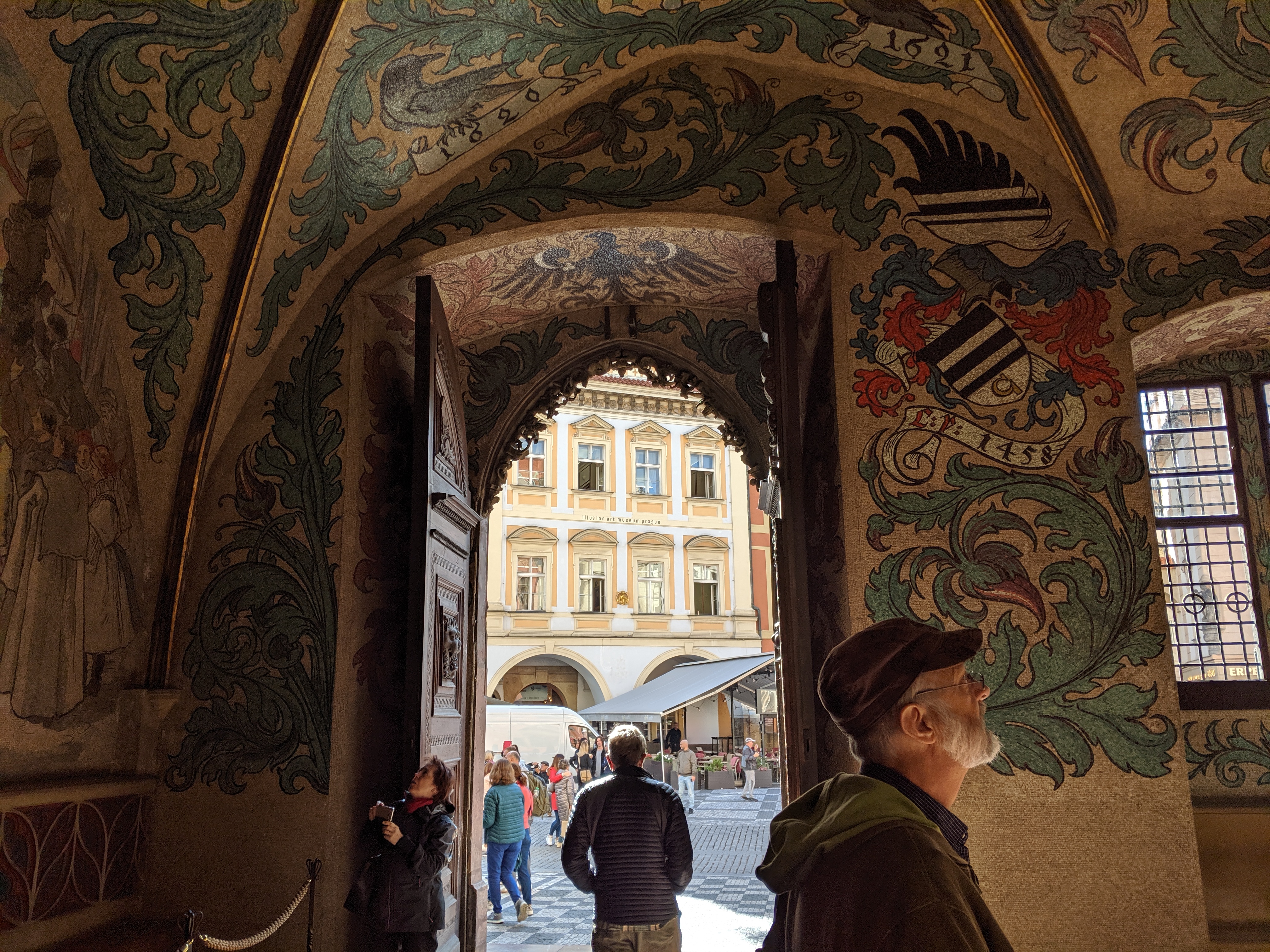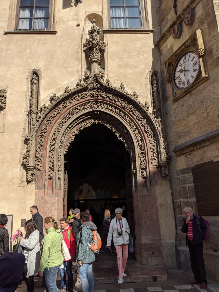 Next to the clock is the entrance to the Old Town Hall, a Gothic-style portal: