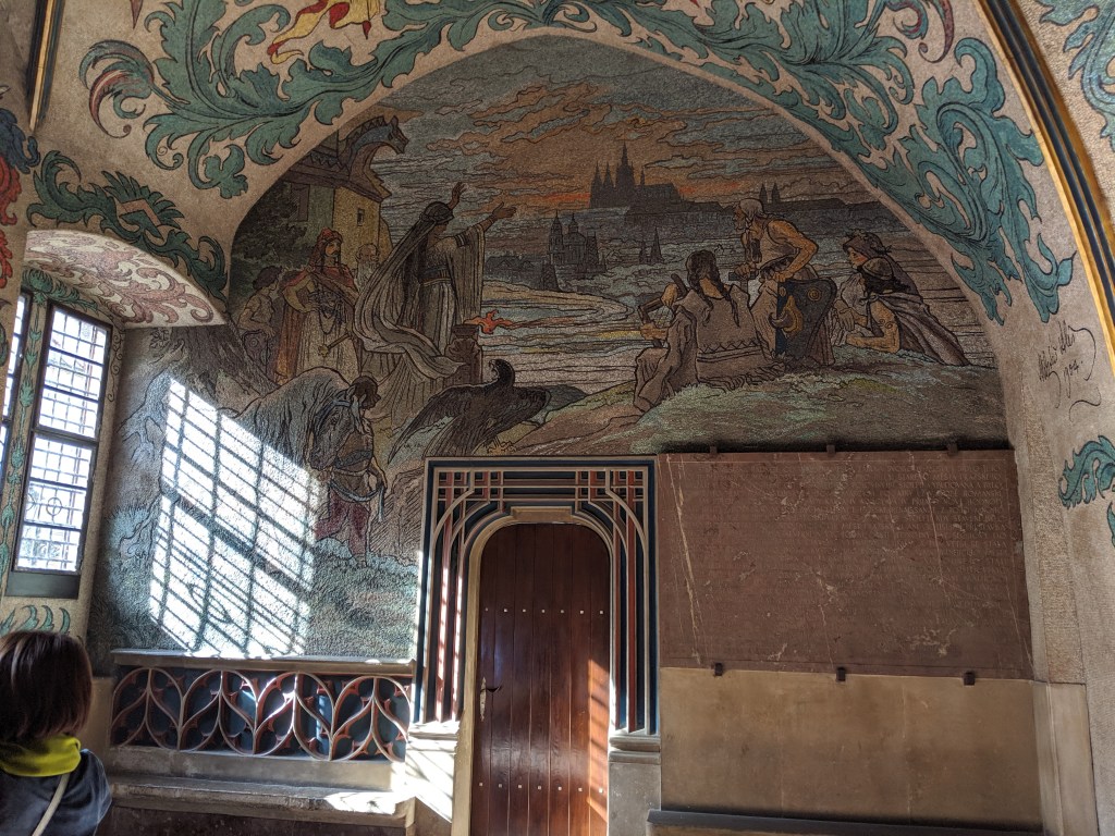 The door leads to an entrance hall decorated with mosaics related to Czech mythology: