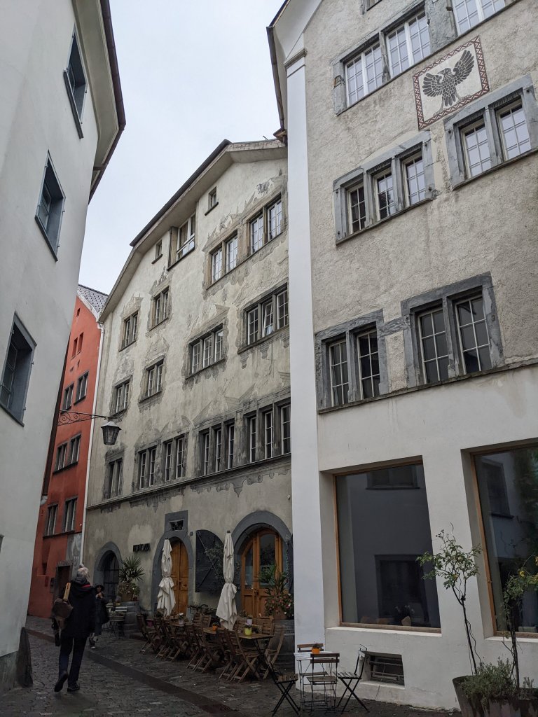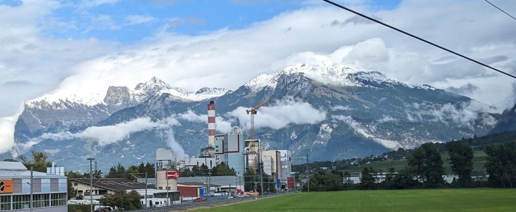 The train journey from Zurich to Chur is worth a few pictures too. For much of the journey, the train travels along the banks of the lakes: Zurichsee, Obersee, and Walensee. Here’s one of the lakes in a less-than-sunny mood, with snow-bedecked peaks peeking out of the cloud: