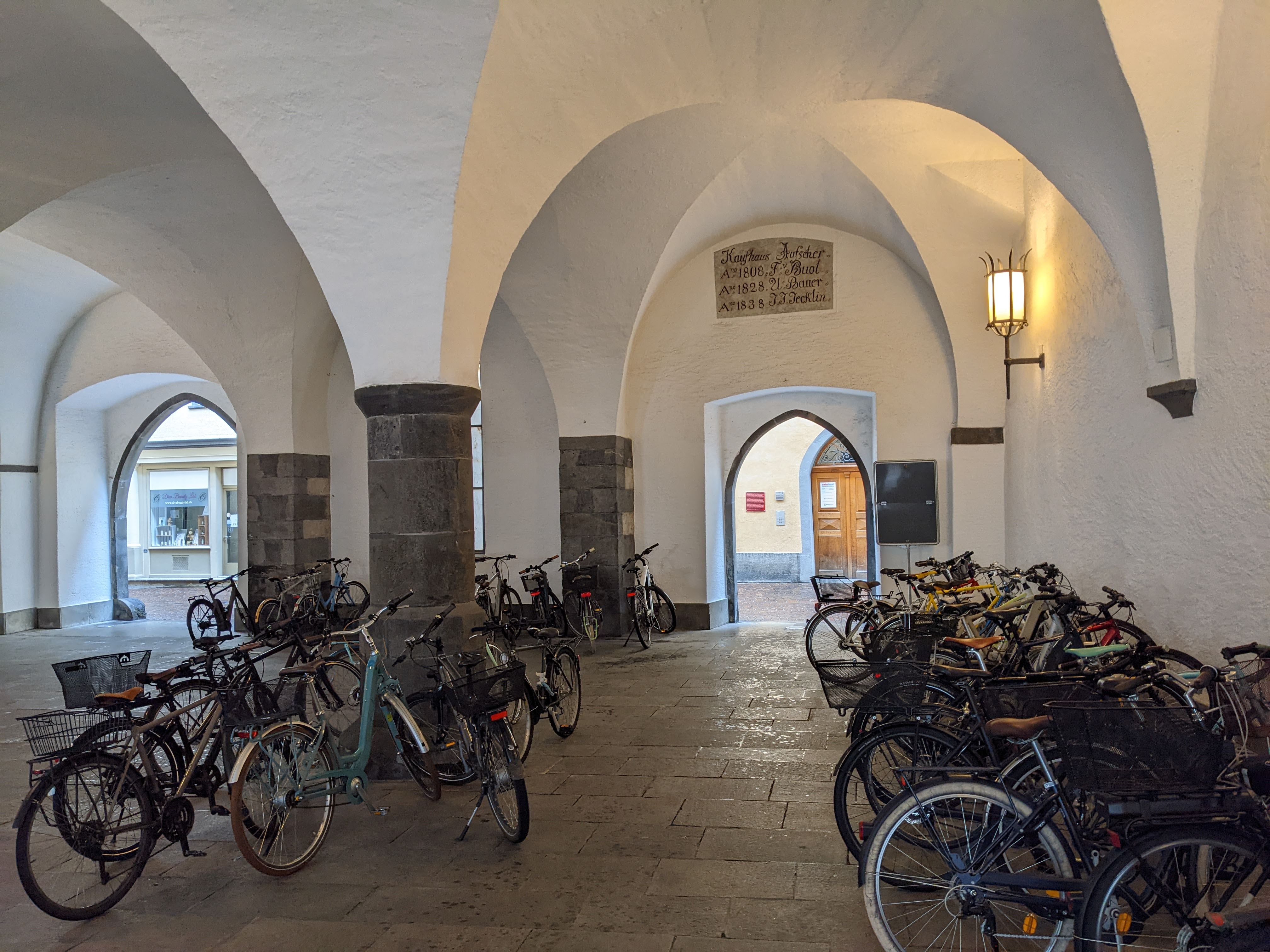 The arched roof of a marketplace next to the town hall, currently a shelter for bicycles.