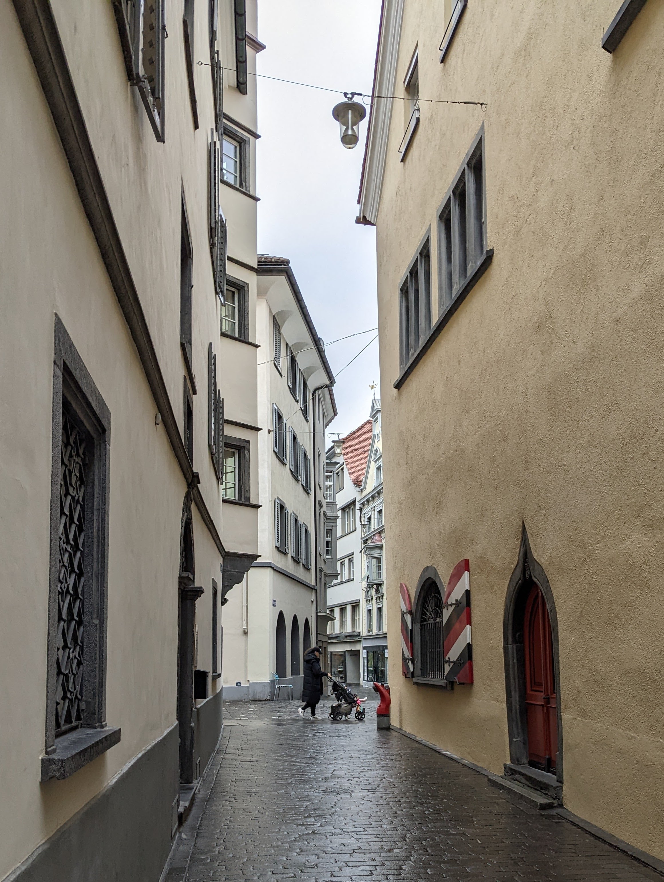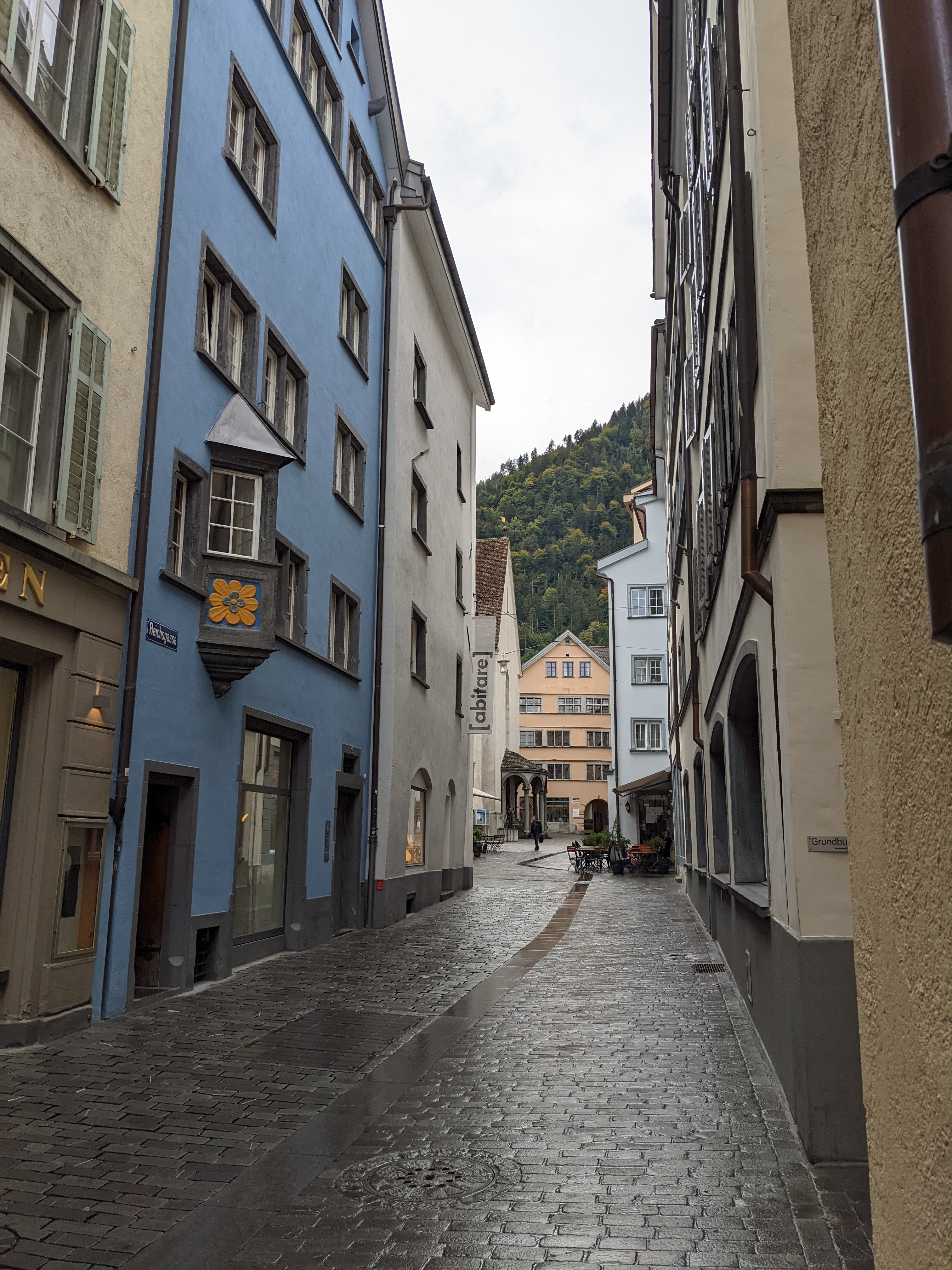 The train journey from Zurich to Chur is worth a few pictures too. For much of the journey, the train travels along the banks of the lakes: Zurichsee, Obersee, and Walensee. Here’s one of the lakes in a less-than-sunny mood, with snow-bedecked peaks peeking out of the cloud: