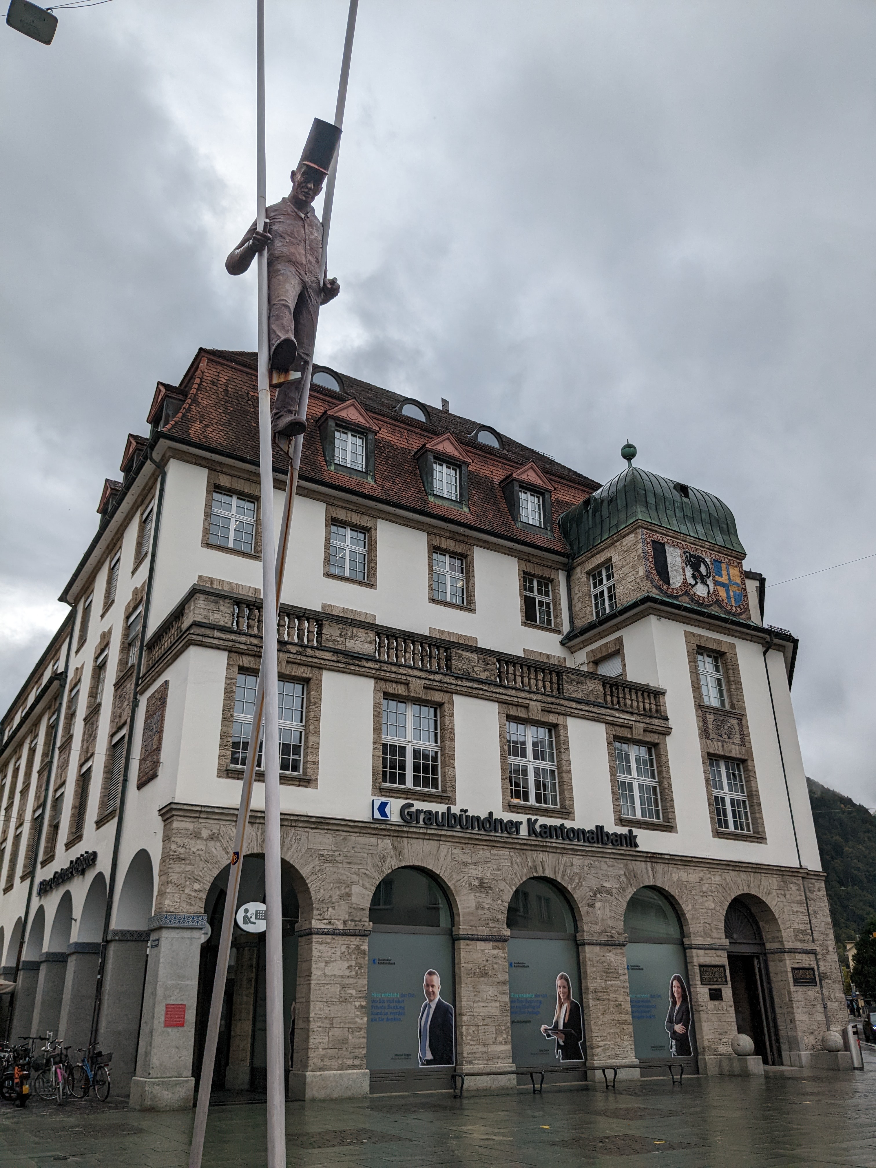 An imposing statue graces the square at the head office of the Graubünden Cantonal Bank — a man on stilts: