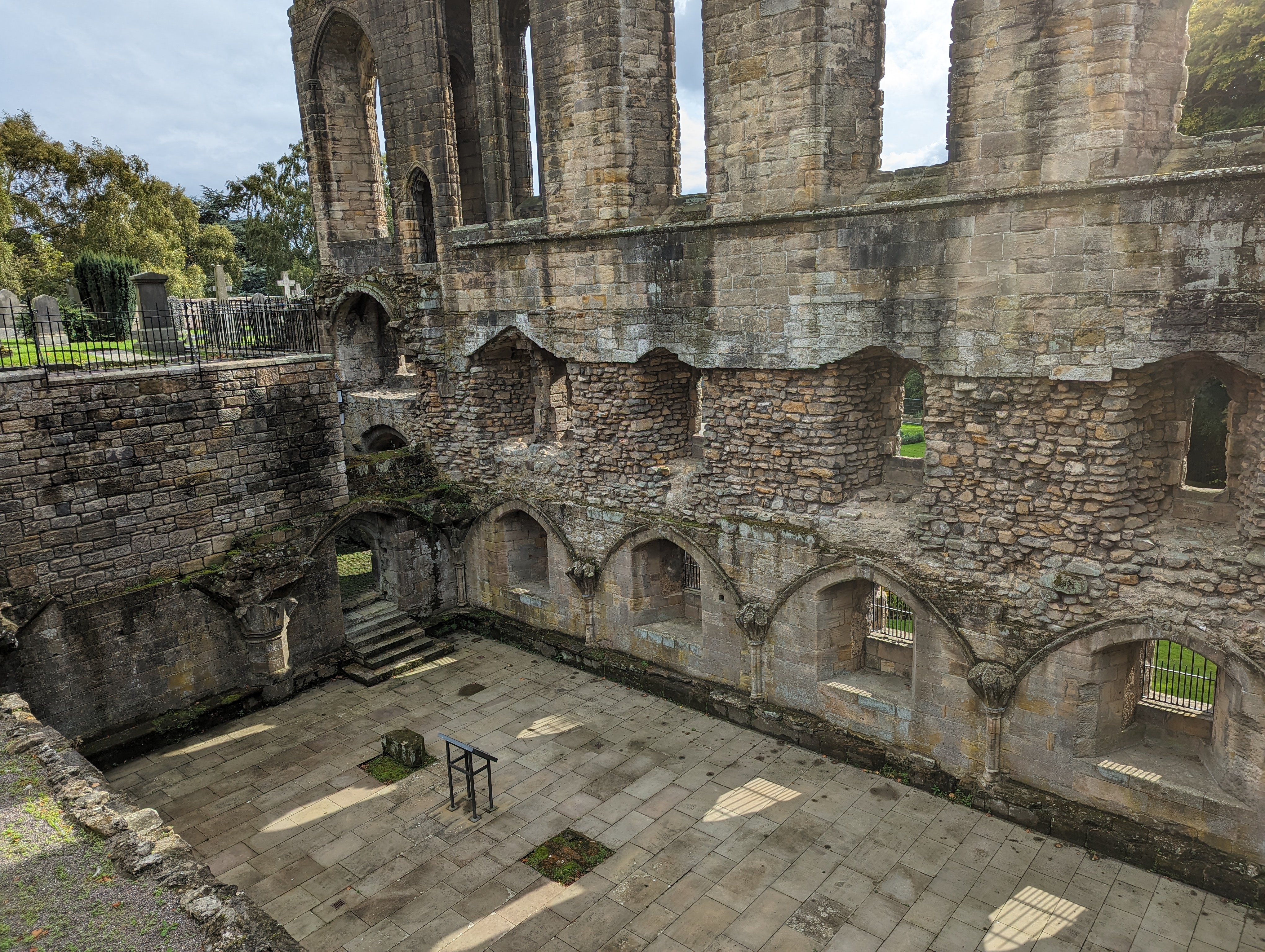 On the right (the eastern half) is the New Abbey Church, constructed in the early nineteenth century. Robert the Bruce is buried under this half of the church. The letters that you see in the balustrade of the square tower spell out “BRUCE KING”.
