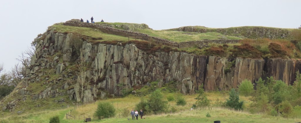 This part of the wall stands atop a high cliff above the stone quarry at Walltown. Here’s a long shot of the cliff topped by the wall: