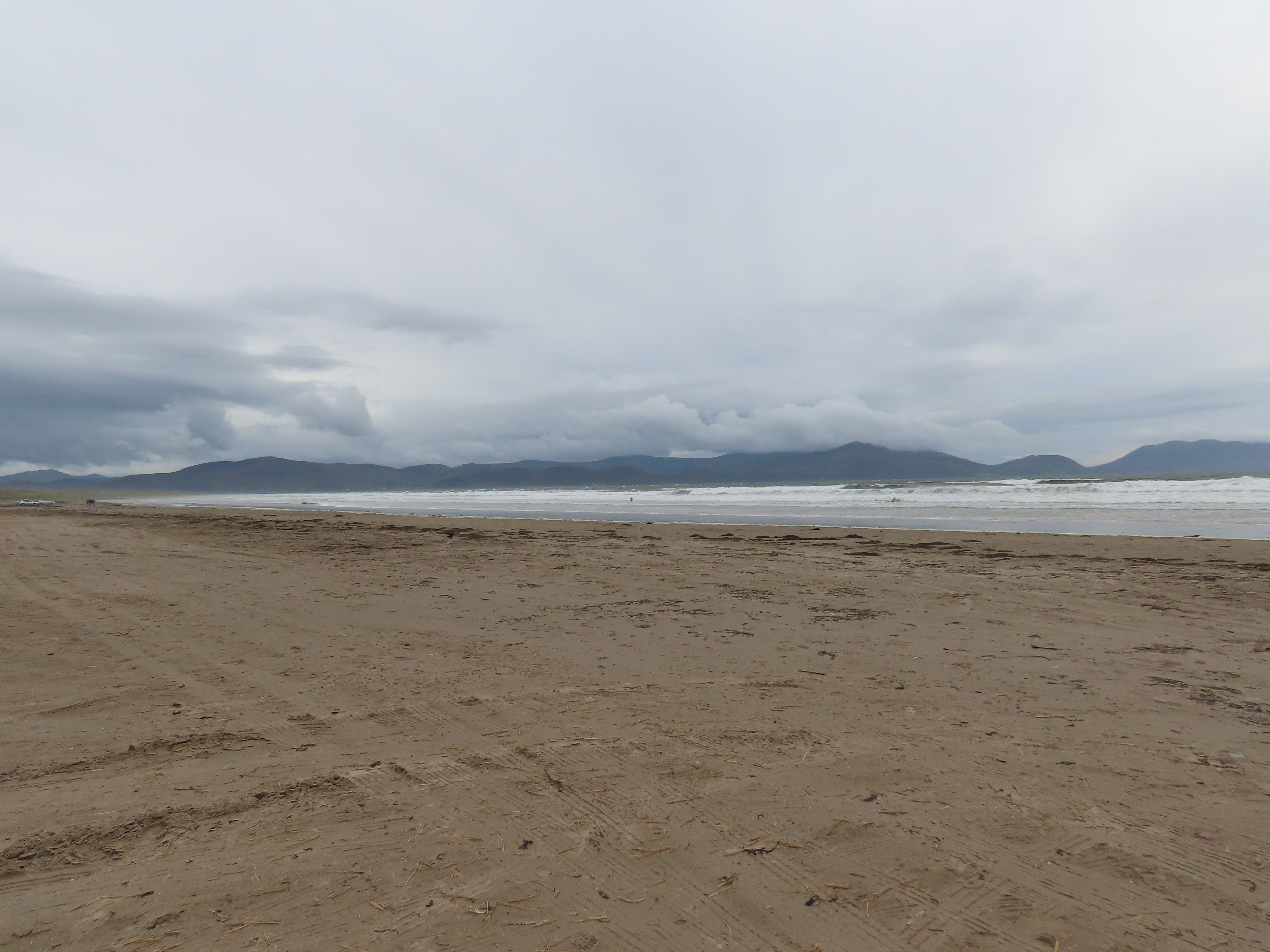 Upon reaching the southern coast of the Dingle peninsula, we headed towards Inch Beach. The TC, bless her cotton socks, had harboured romantic notions of dipping her toes into frilly waves on a golden shore cooled by a playful breeze. Instead, we encountered a somewhat fierce beach with a banshee wind and but two hardy souls venturing into the salty surf: