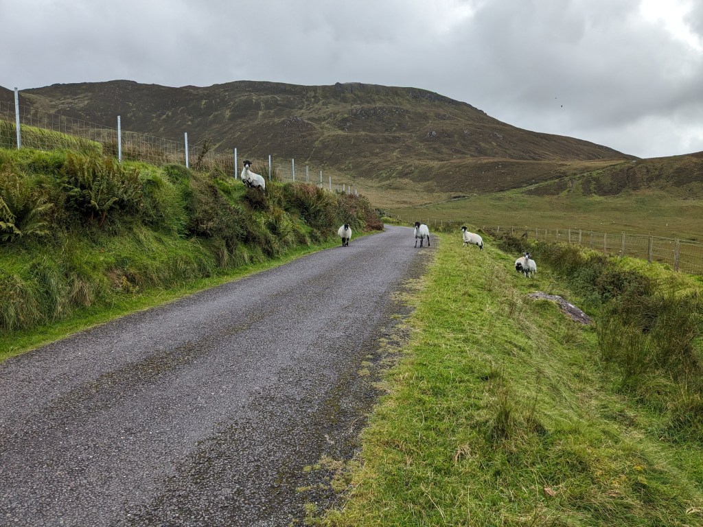 We branched off from the main thoroughfare (N86) at Camp and took the Caherconree scenic route. This is a gorgeous, single-track road through the mountains. Tumbling rivers and sure-footed sheep lined the way: