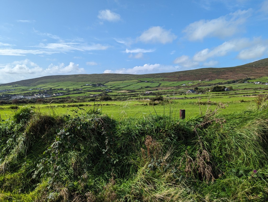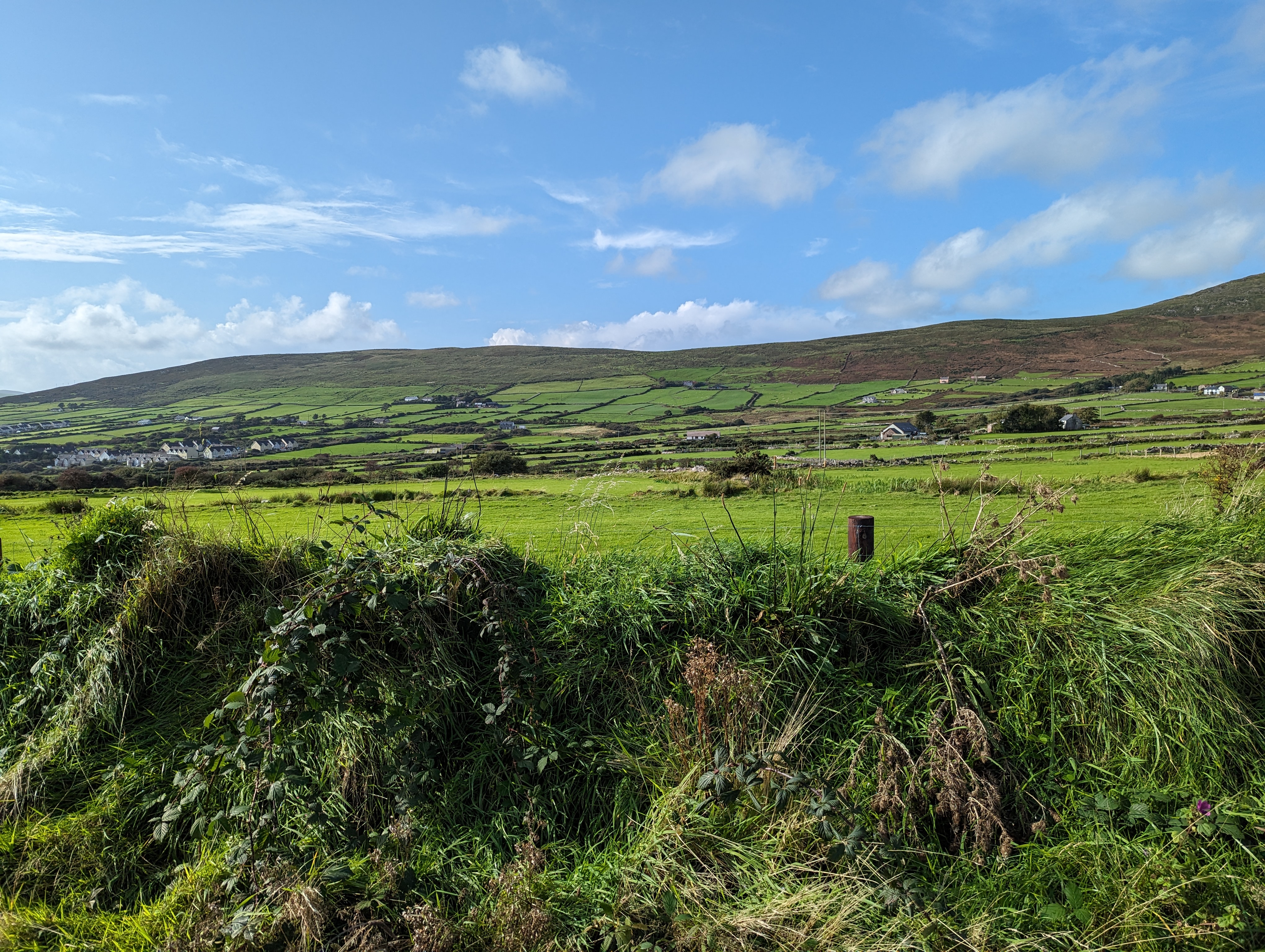 Leaving Dingle, the road heads through green fields and hedgerows: