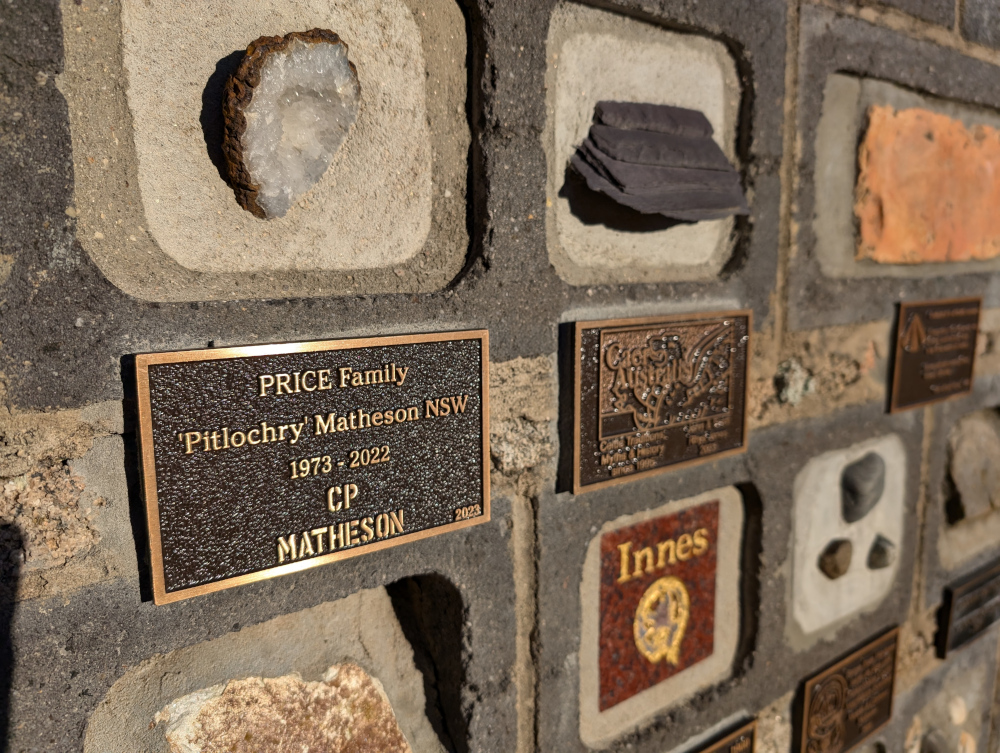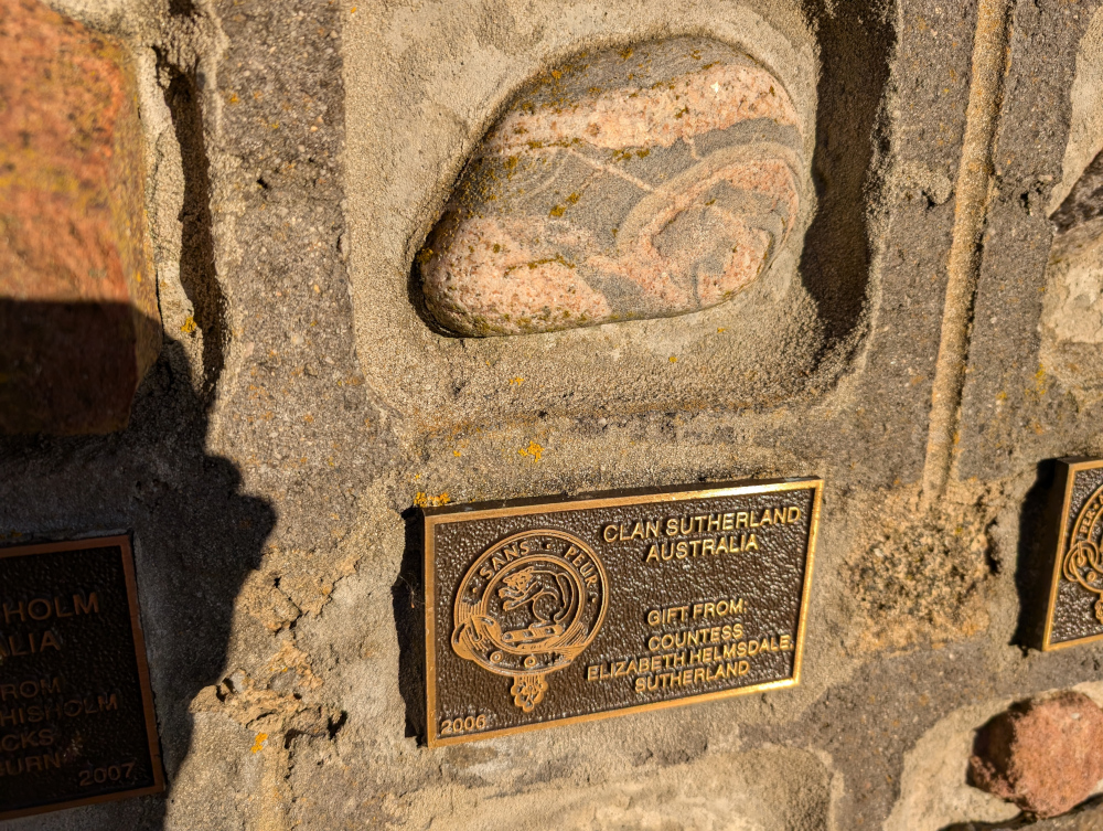 A wall curves round the path, embedded with gifts of stone from various sponsors of the monument: