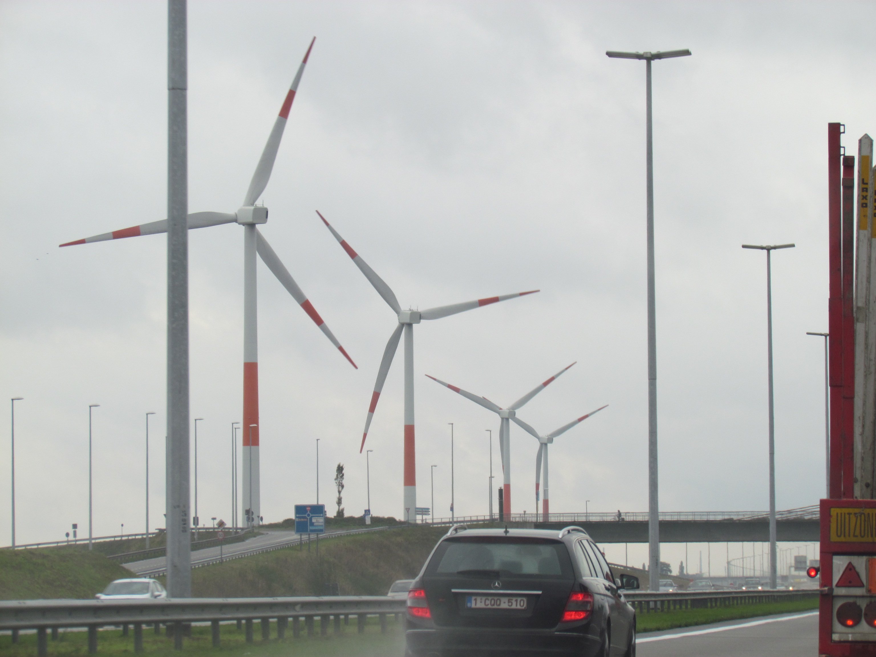 A row of windmills looms over the road on the border between the Netherlands and Belgium. The blades were turning in eye-catching synchronisation as we approached: