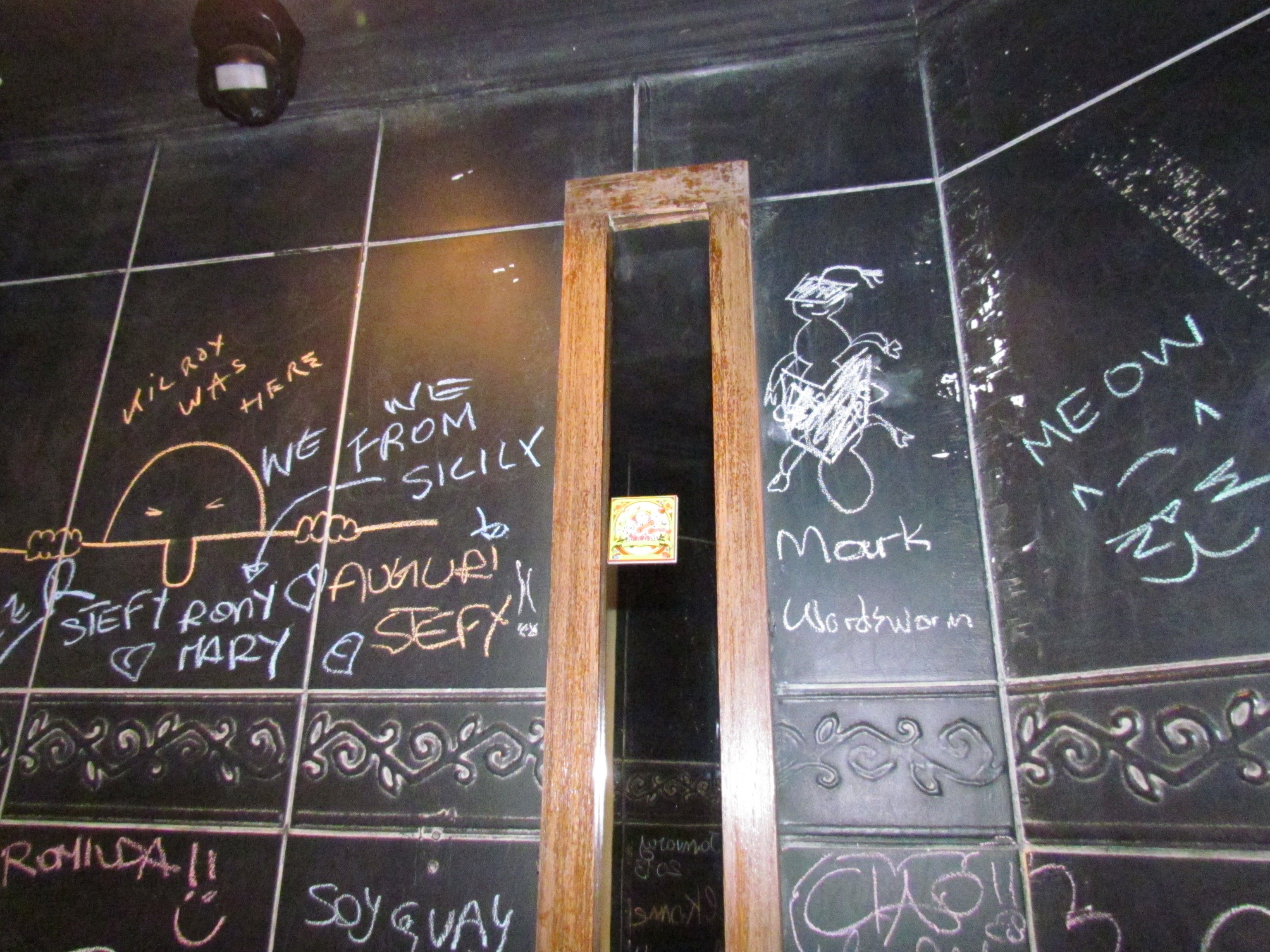 The wall in the ladies’ toilet at Houtsiplou is covered with blackboard. Pots of chalks stand at hand. The TC, bless her heart, decided to draw a picture of me. Can you imagine! She’s no artist at the best of times. When the “TC once removed” saw the drawing, his immediate impression was that this worm is sitting on the loo. The TC hastened to assure him that the rounded protuberance at the bottom of the drawing is part of this worm’s body.