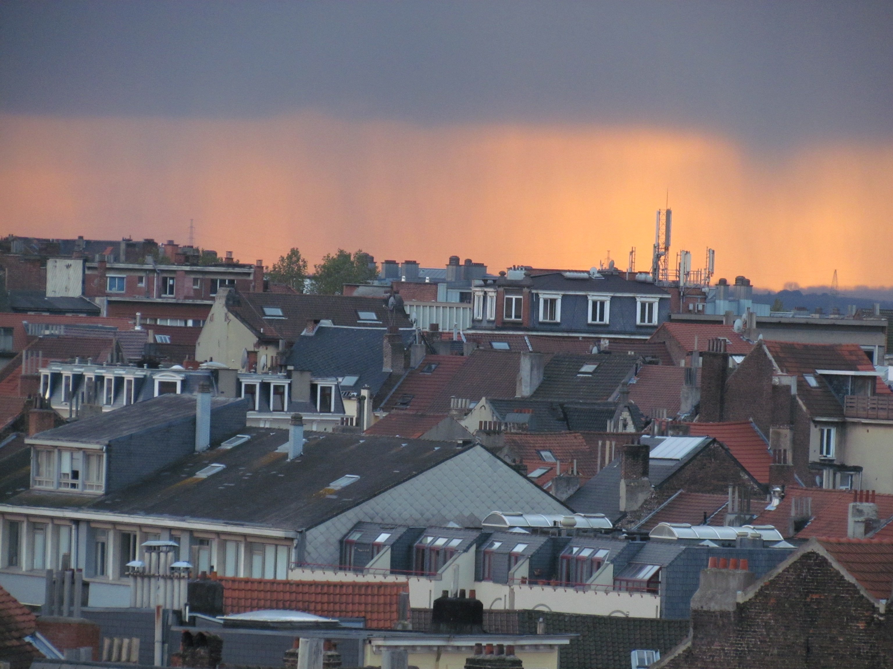 The view from our room at the Pantone Hotel – a rainstorm drifts in across the rooftops of Brussels: