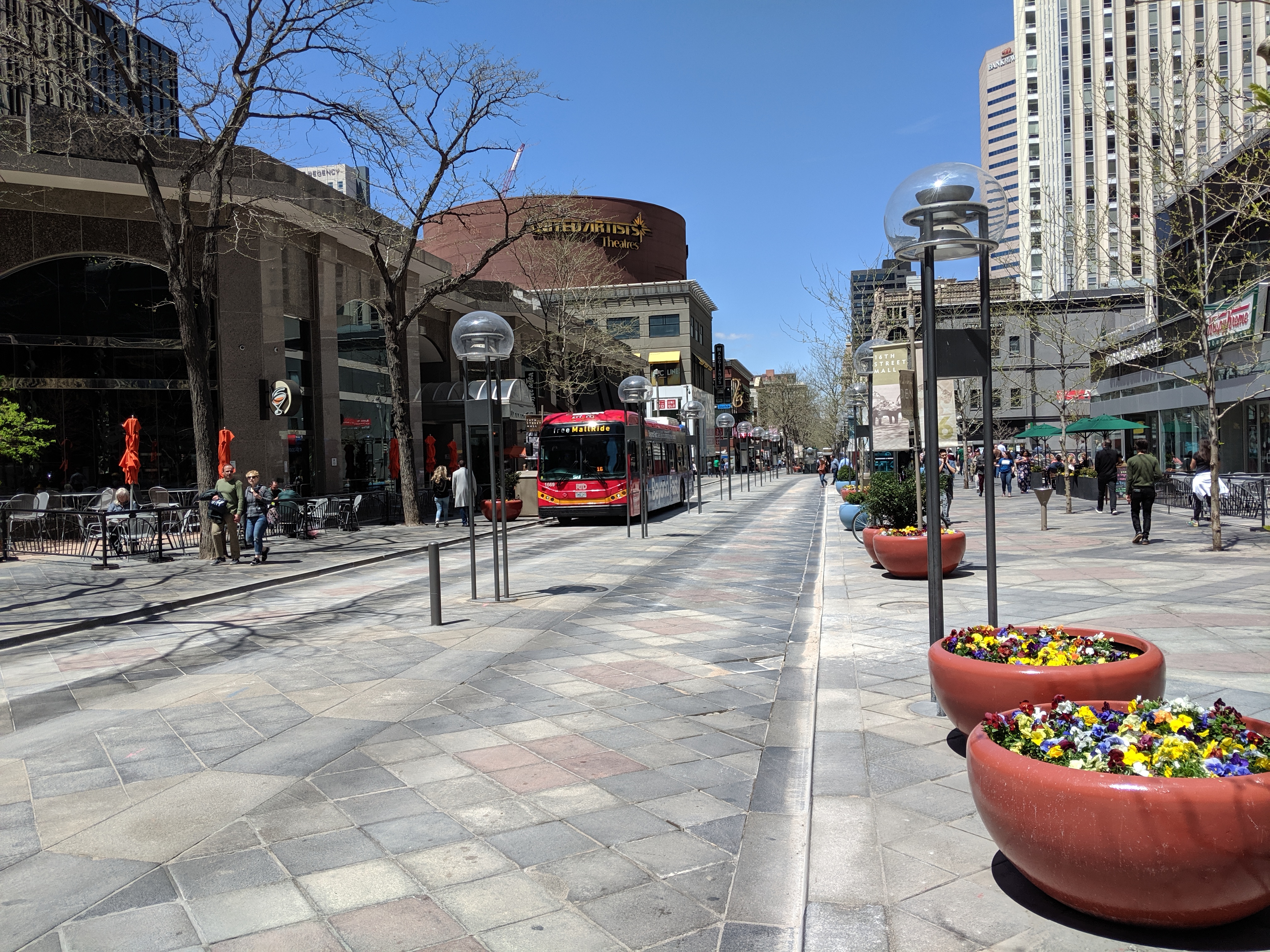 The 16th Street Mall is a pedestrian walkway that runs for about a mile through downtown Denver. It was designed by an architect named I.M. Pei. This shot of the mall shows one of the shuttle buses that offer free rides from one end of the mall to the other: