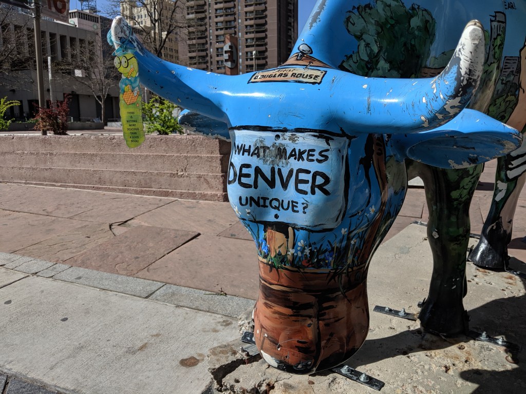 Me hitching a ride on one of the cows that hang out on Denver’s 16th Street Mall: