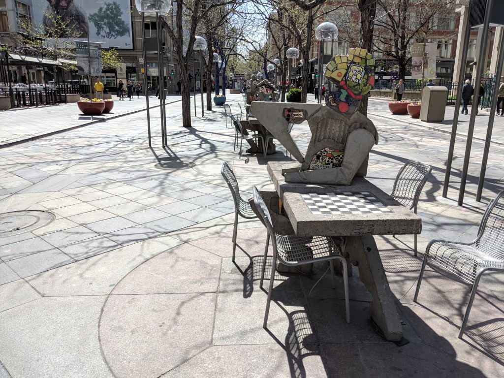 An innovative design for a table, on the 16th Street Mall in Denver. Even when there’s no-one sitting at the bench, it looks like a happy place to be: