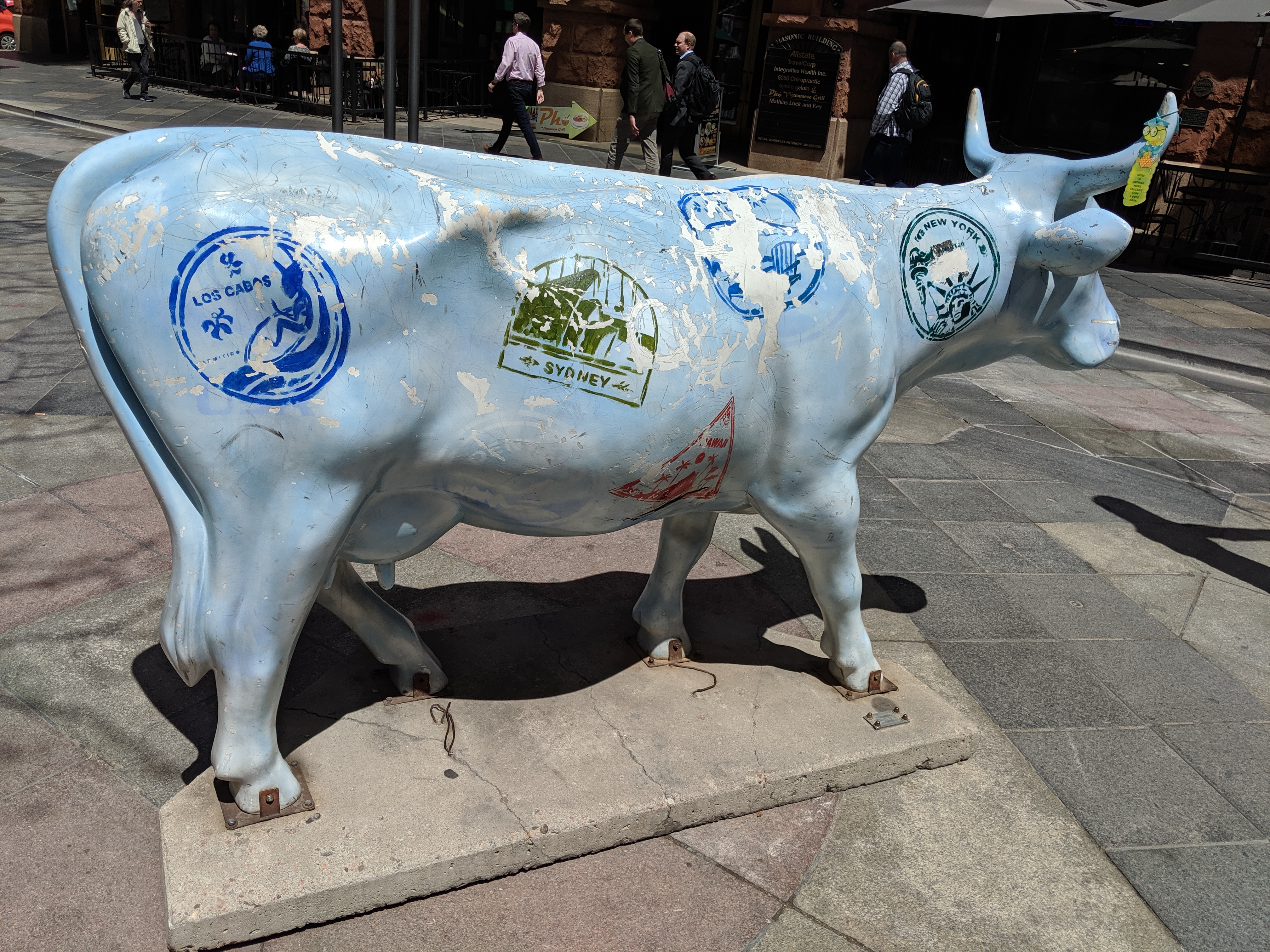 Another cow on the mall. When I got up close, this one whispered to me the name of my home town. Nice beast!