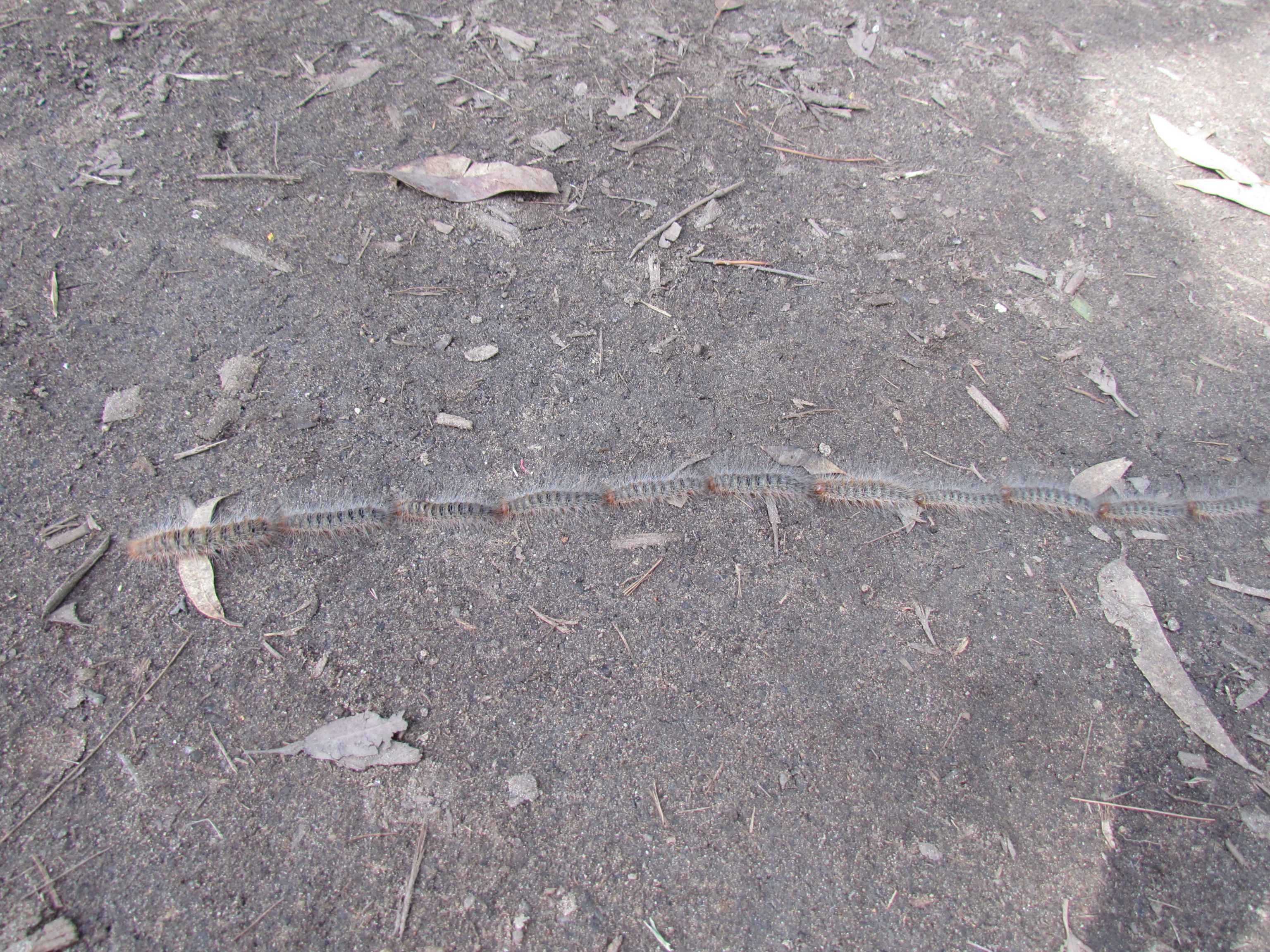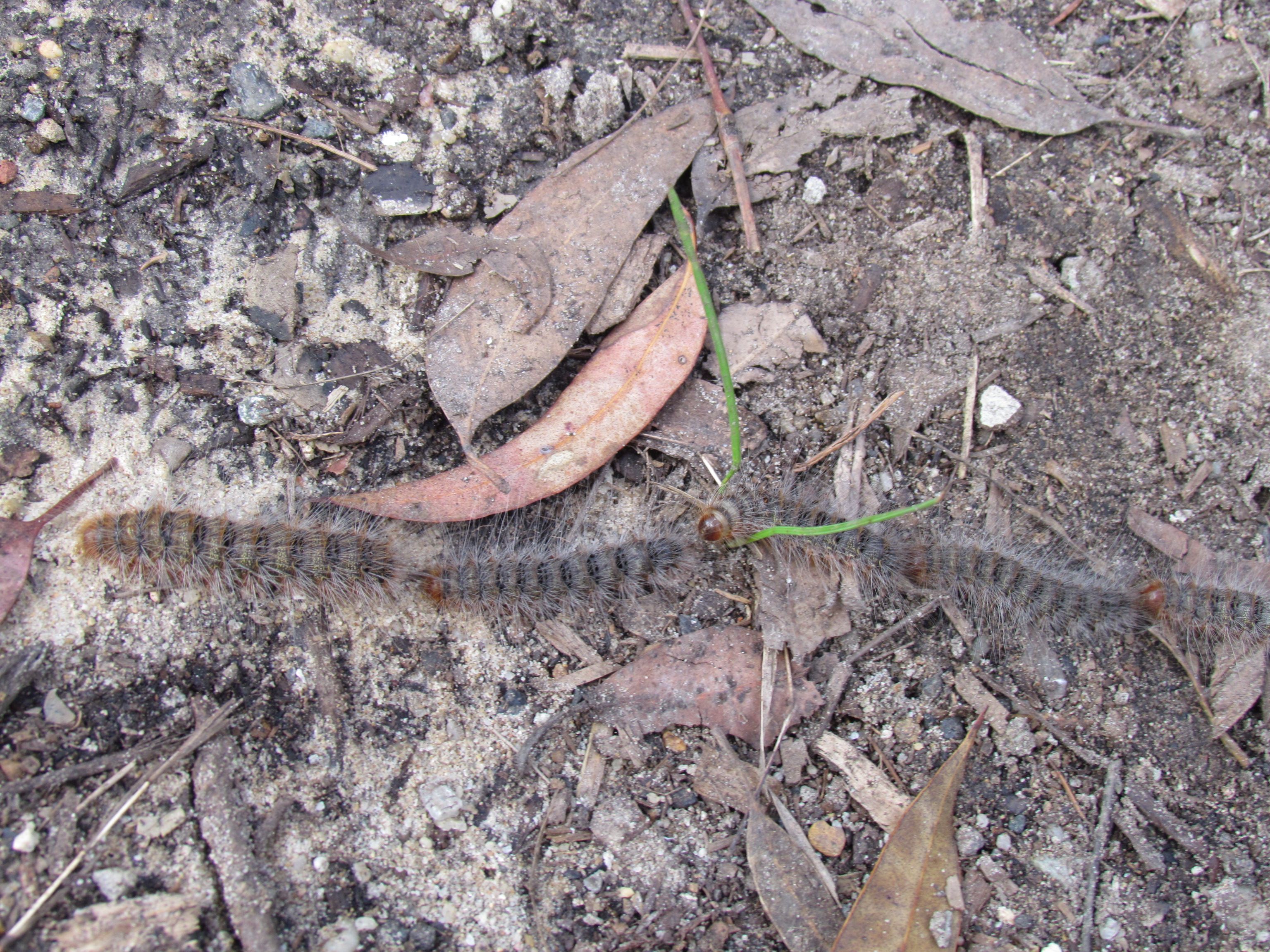 The caterpillars are the larvae of the Bag-Shelter Moth, so called because they build themselves a little bag of silk to hide in. Their scientific name is Ochrogaster lunifer. The little hairs on the caterpillars can cause skin irritation, so be wary of getting too close.