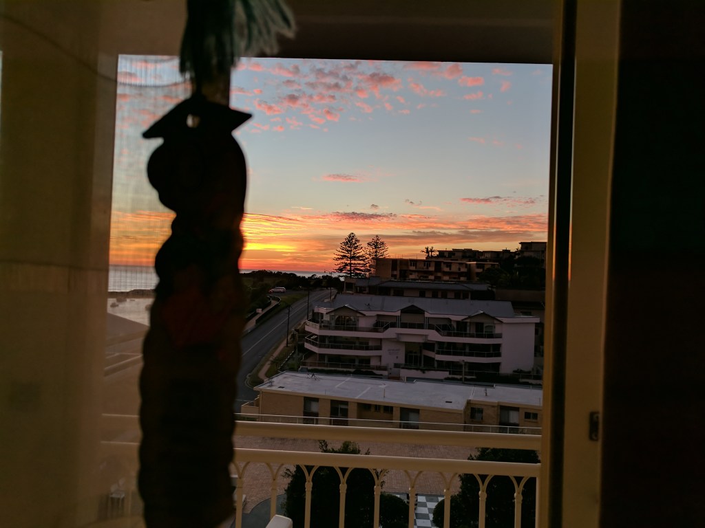 Me and the rising sun, at the window of the Crowne Plaza hotel in Terrigal: