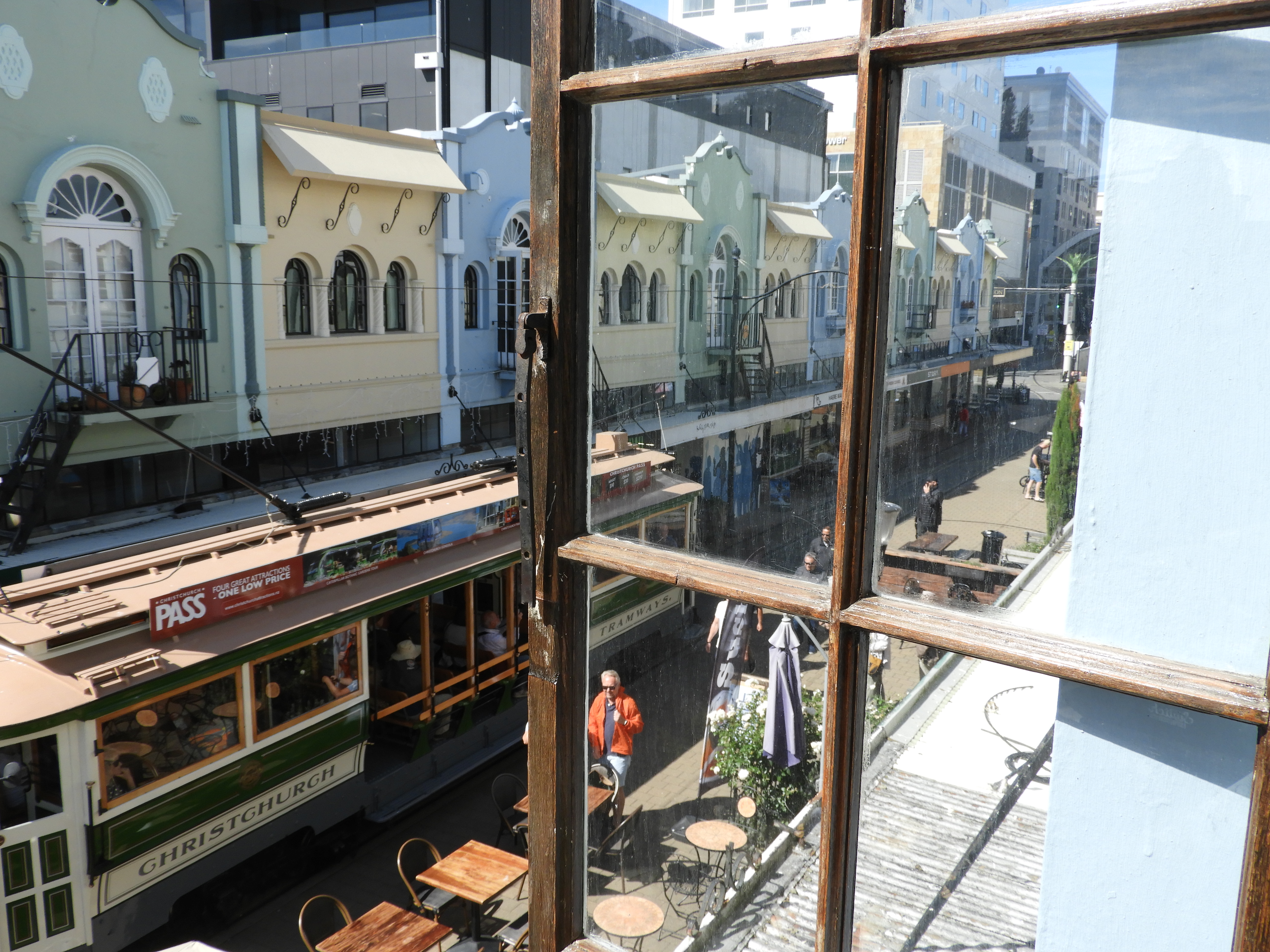 A block away, Christchurch’s heritage tram click-clacks through a picturesque street of restaurants and shops: