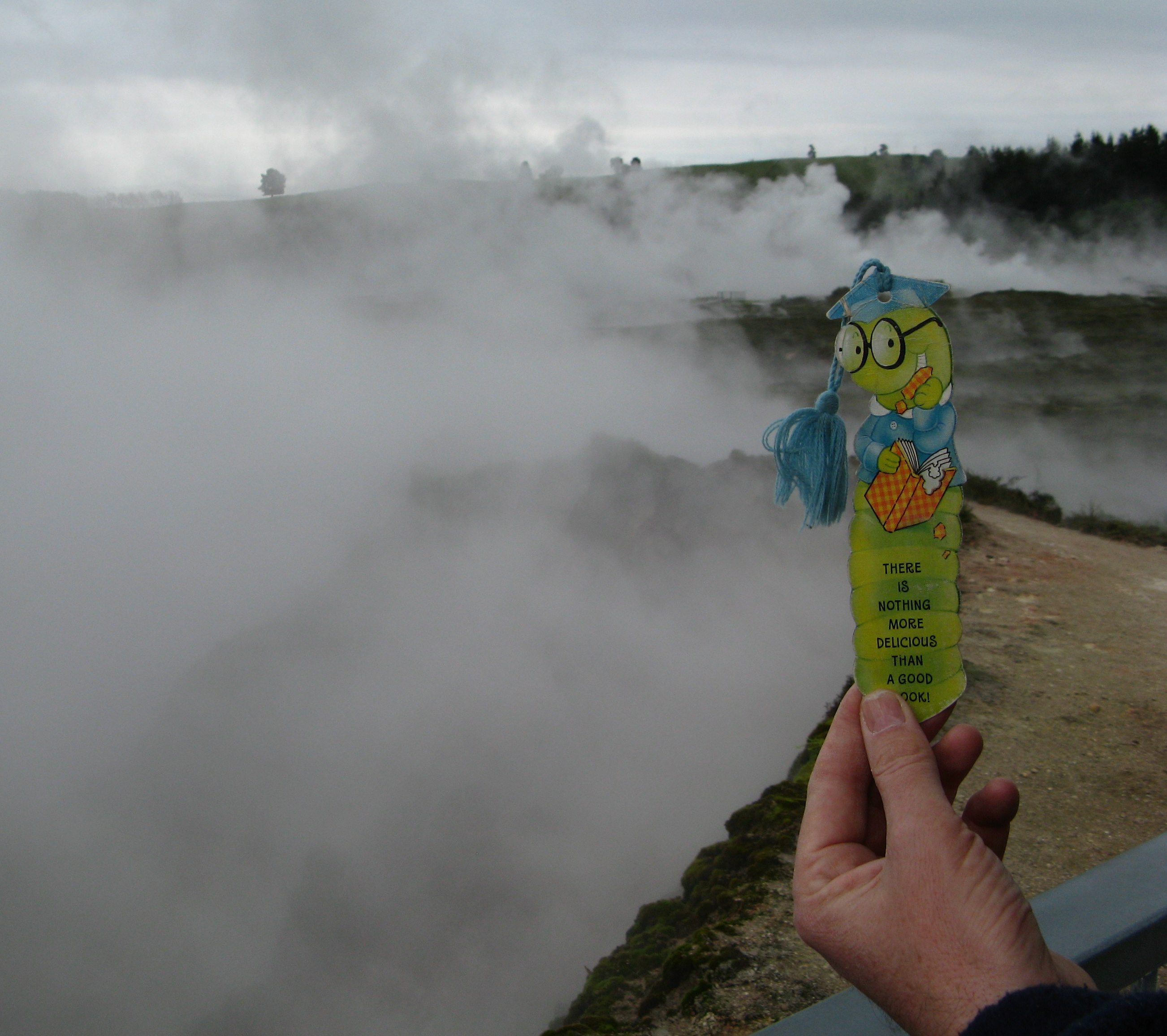 That’s steam you see boiling up from the crater below me. As is her wont, the TC is quite happy for me to be exposed to the utmost peril in the interests of a good photo. Has she considered, I wonder, what such hot wet stuff could do to a bookmark like me? Talk about pulp fiction!