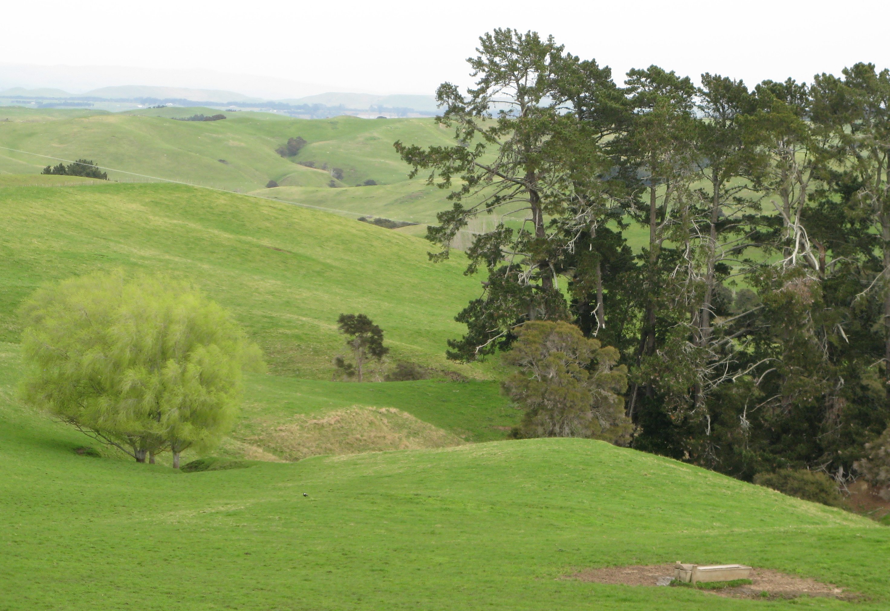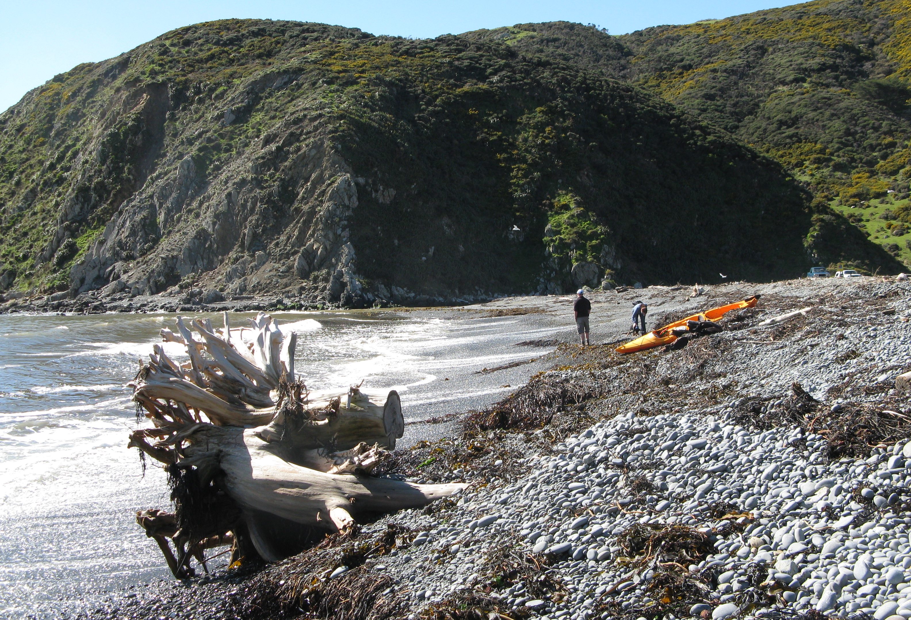 Huge dead trees clutter the countryside. The beaches are made of black pebbles. This is Makara, near Wellington: