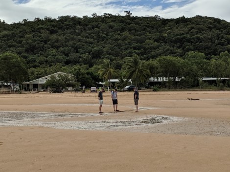 Jonathan and his mates enjoy a moment of quiet reflection on The Strand, with Magnetic Island as a backdrop: