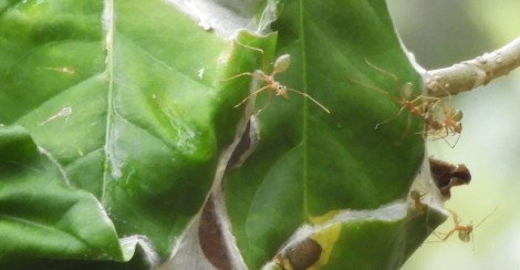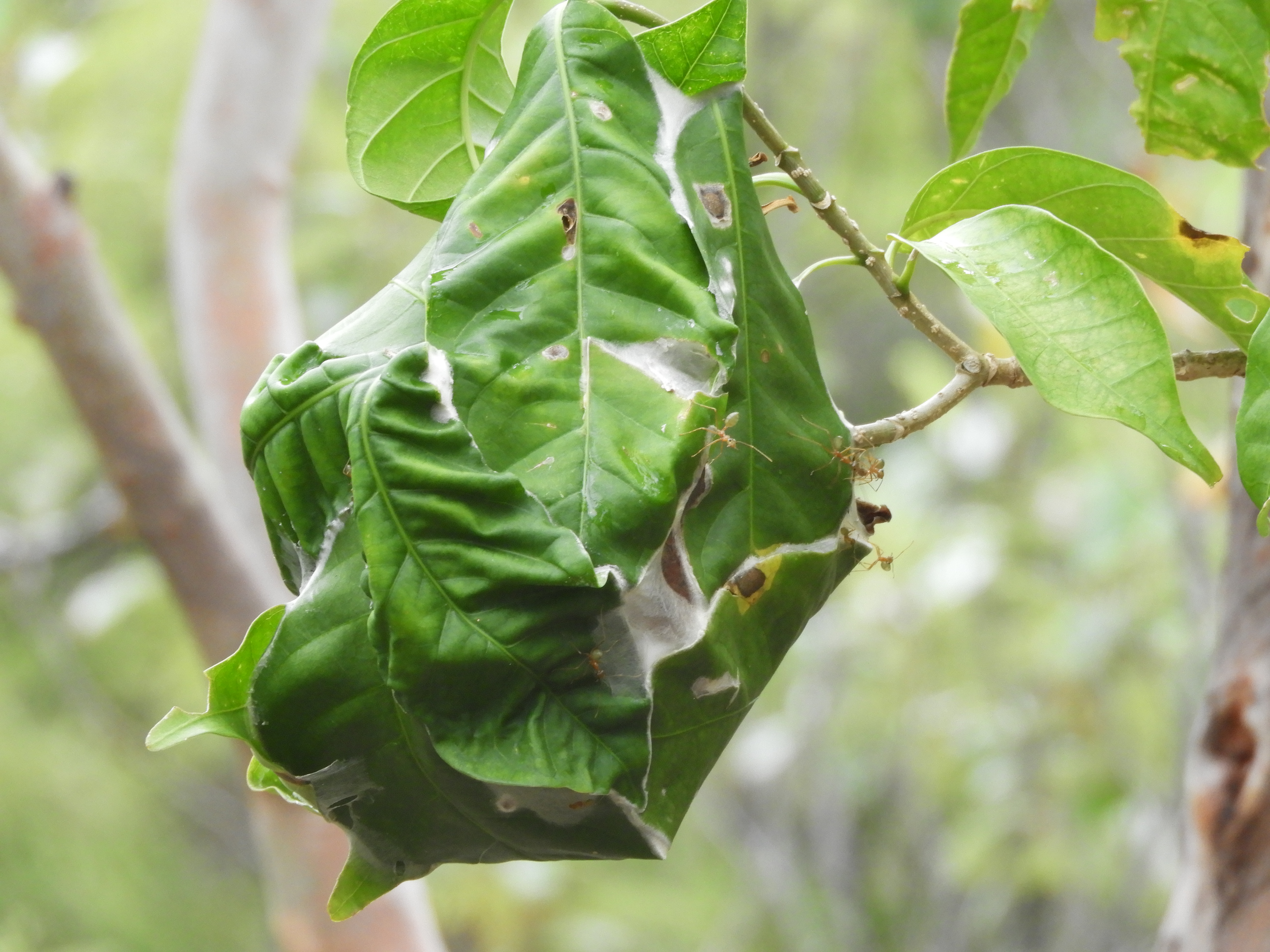 Could this be the work of a caterpillar like that of the fall webworm or tent caterpillar, which create nests of silk? Looking closer, we noticed ants on the leaf bunches. I’ve since done some research and discovered that these are green tree ants, a type of weaver ant. The adult ants gather in large numbers and pull the leaves together. Then they bring an ant larva, which produces the web to hold the leaves in place: