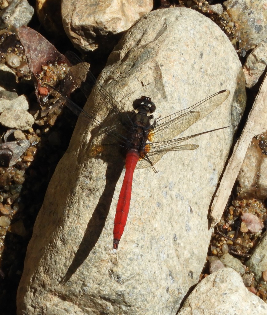 Me in a somewhat intimate encounter with the wildlife at Little Crystal Creek. This scarlet dragonfly was persistent and curious: