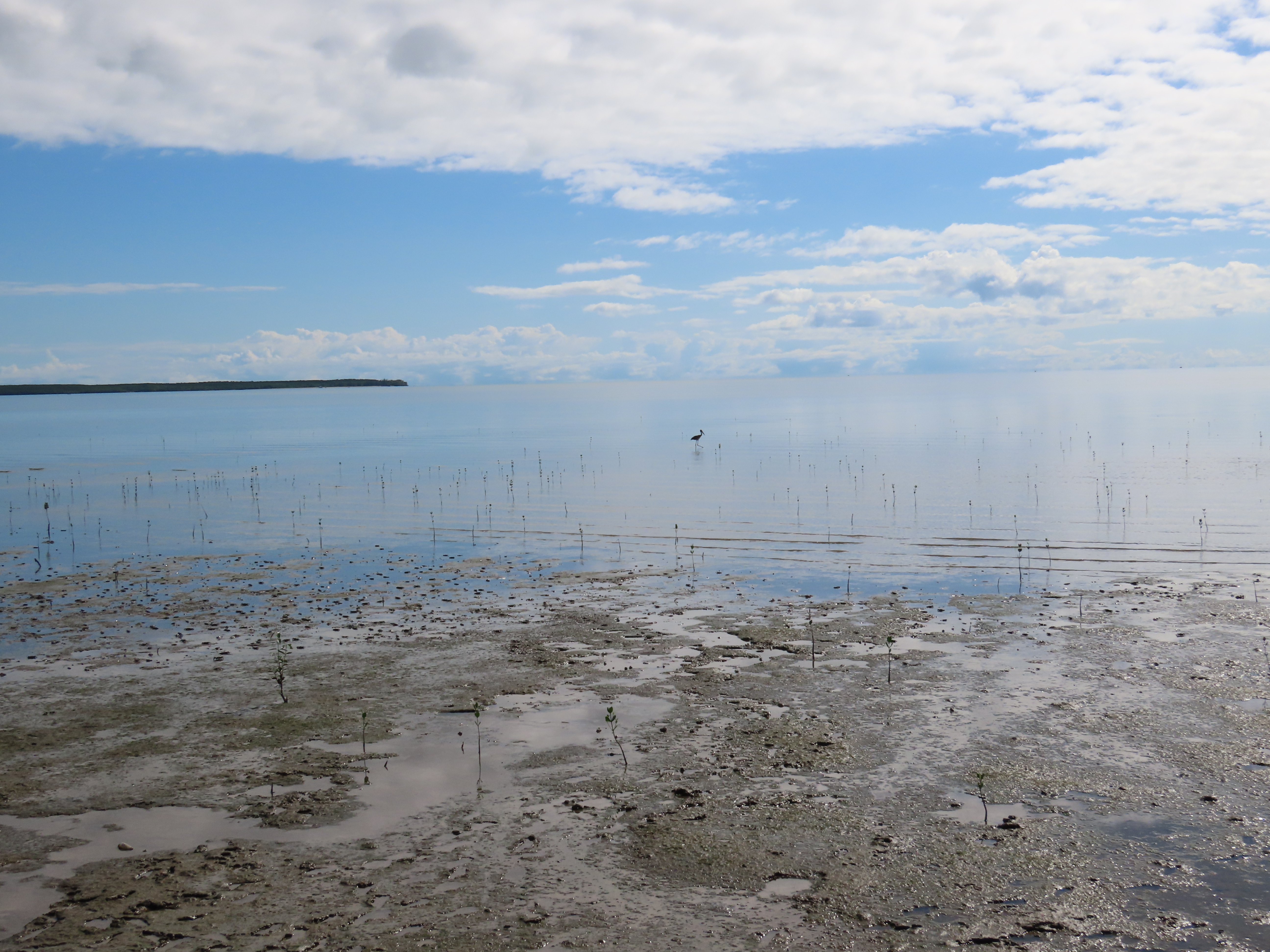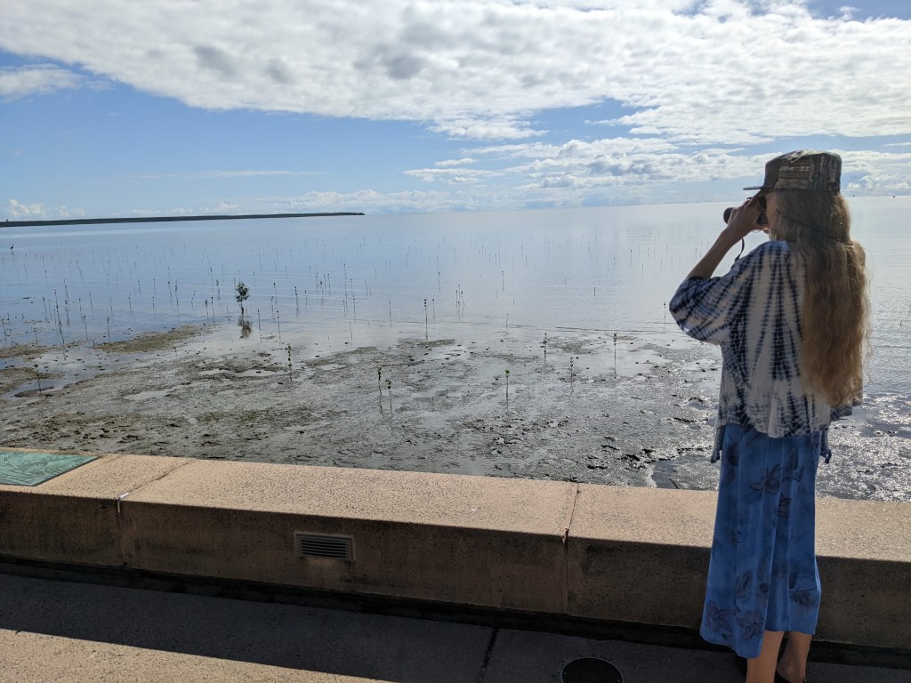 Beyond the sculpture, the bay of Cairns presents an ever-changing vista. At low tide, it’s a mud flat with mangroves popping up here and there: