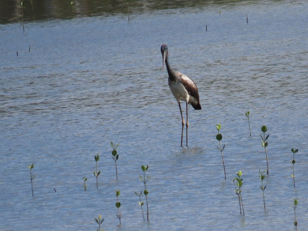 In the distance is a Black-necked Stalk, stalking (that’s right, stalking) the shallows for a bite to eat. Here’s a closeup view of the rather lugubrious character: