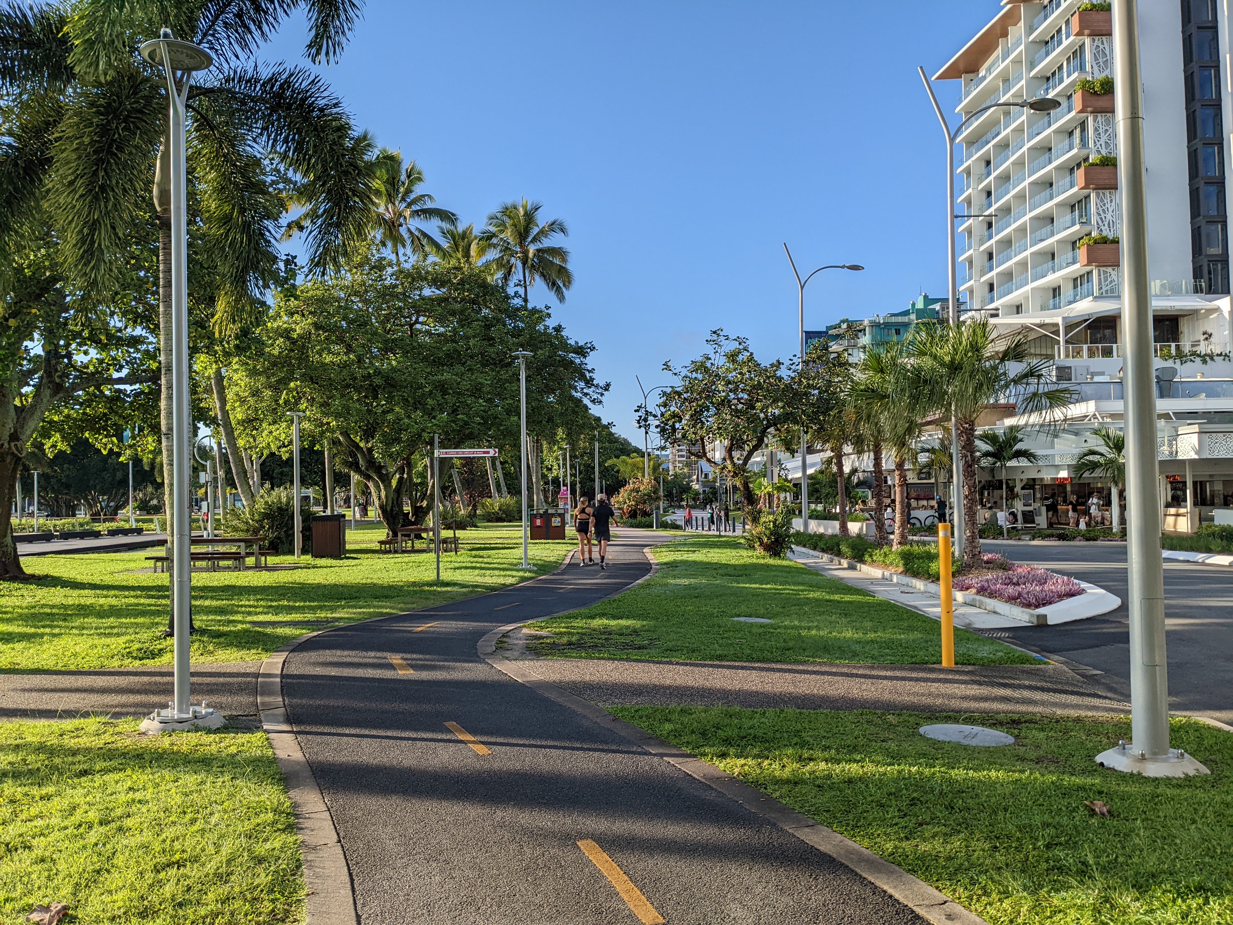 On one side of the Esplanade lies the Coral Sea. On the other side, enticing eateries and shops line the road beyond the green sward: