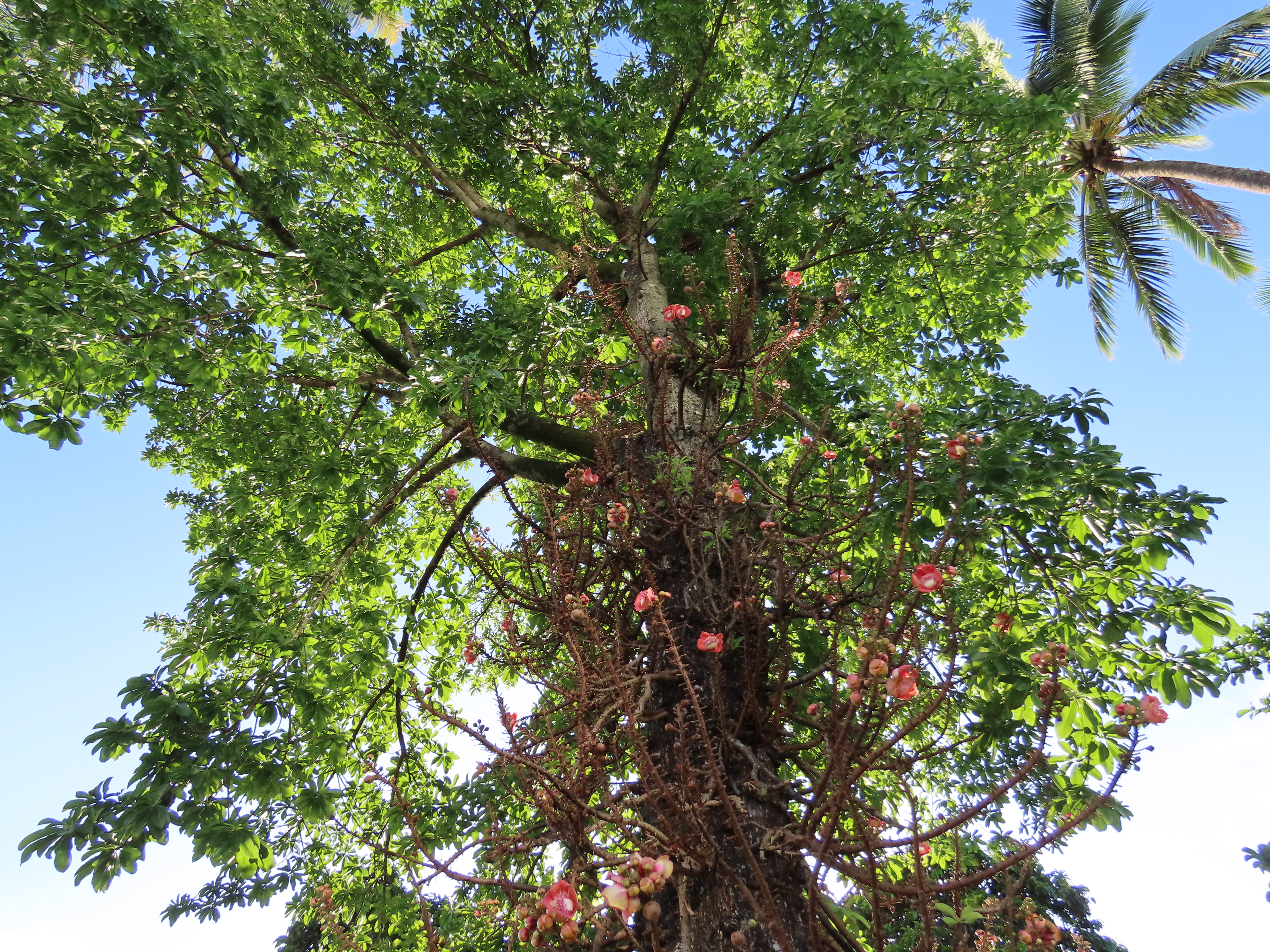 Trees and grass in the middle of the Esplanade offer relief from the tropical sun. This flowering tree caught my eye because the flowers grow on stalks low down on the trunk and quite separate from the canopy of leaves: