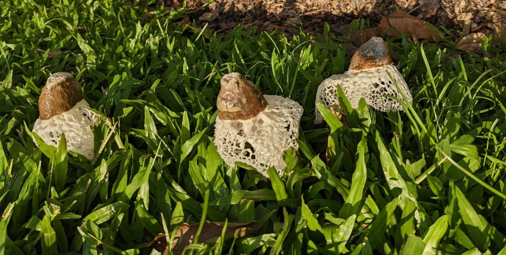 Let’s finish the story with a return to nature and its oddities. These weird-looking mushrooms, which the TC, bless her soul, spotted just off the Esplanade, are Veiled Lady Mushrooms: