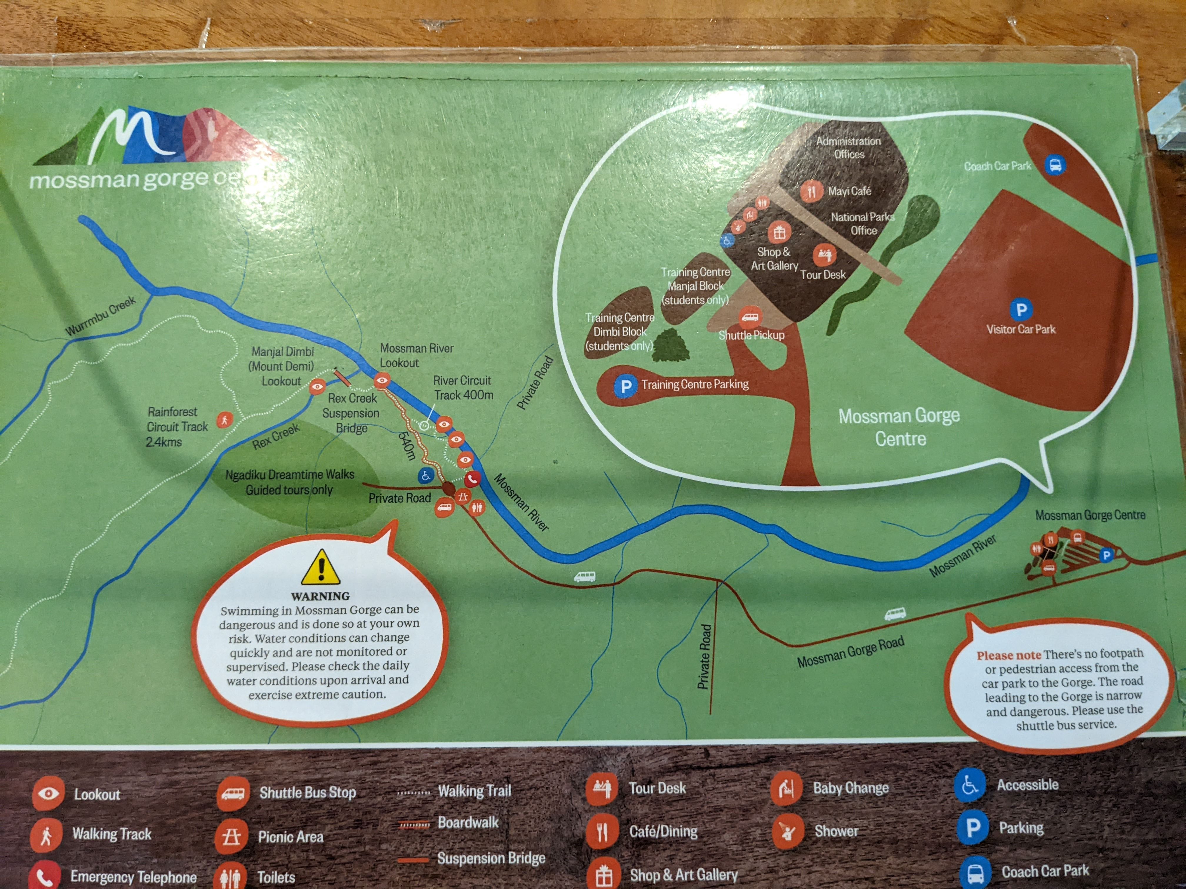 The Mossman Gorge circuit track offers a lovely way to experience the rainforest. The track is well maintained, and fine to do without a guide. This map of the area shows the car park on the right. From the car park, we caught the shuttle bus to the start of the trail: