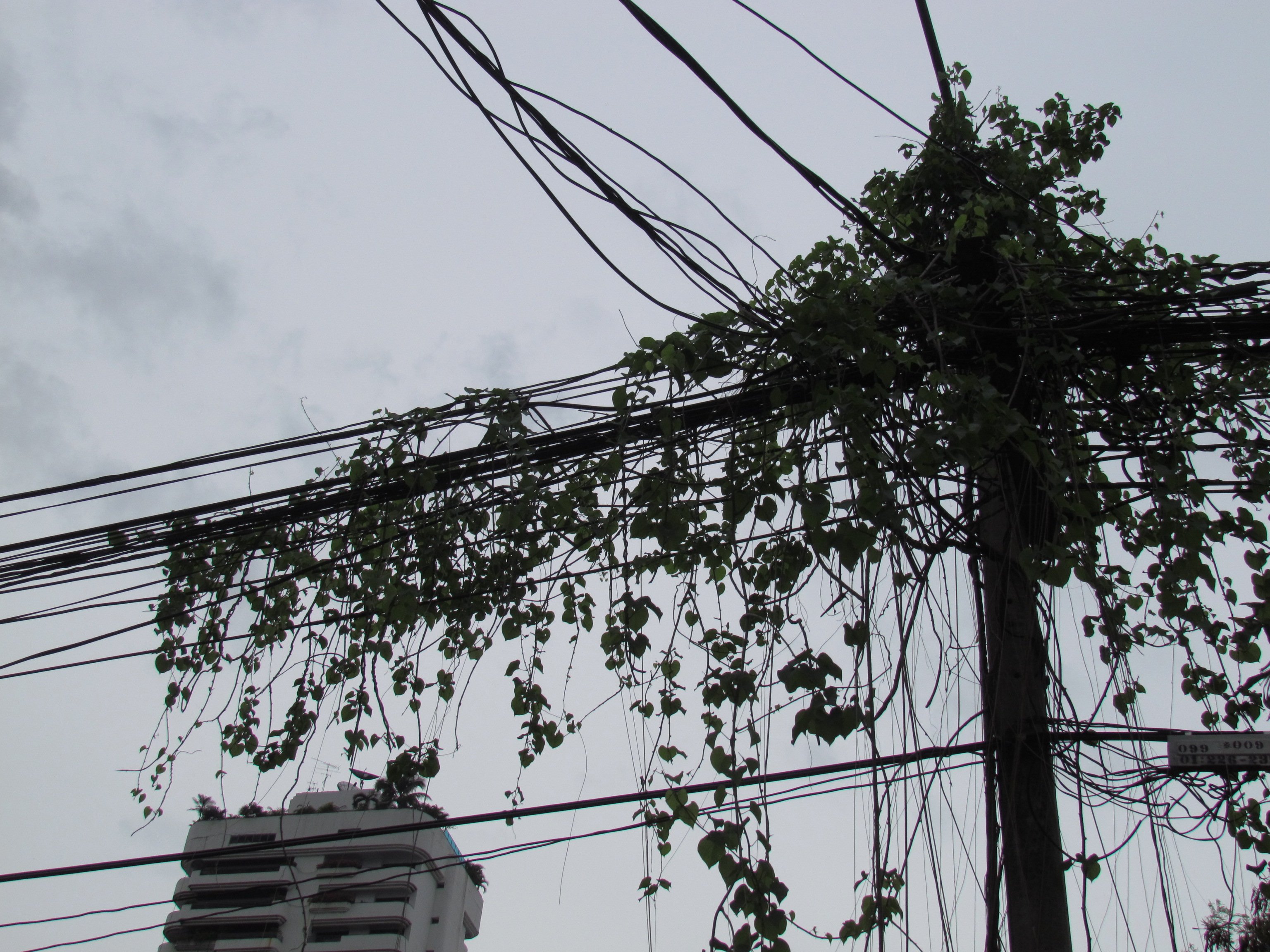 Cables are draped haphazardly over poles and road constructions. This worm is amazed that the phone and electrical networks function. Here, vines add to the general drapery: