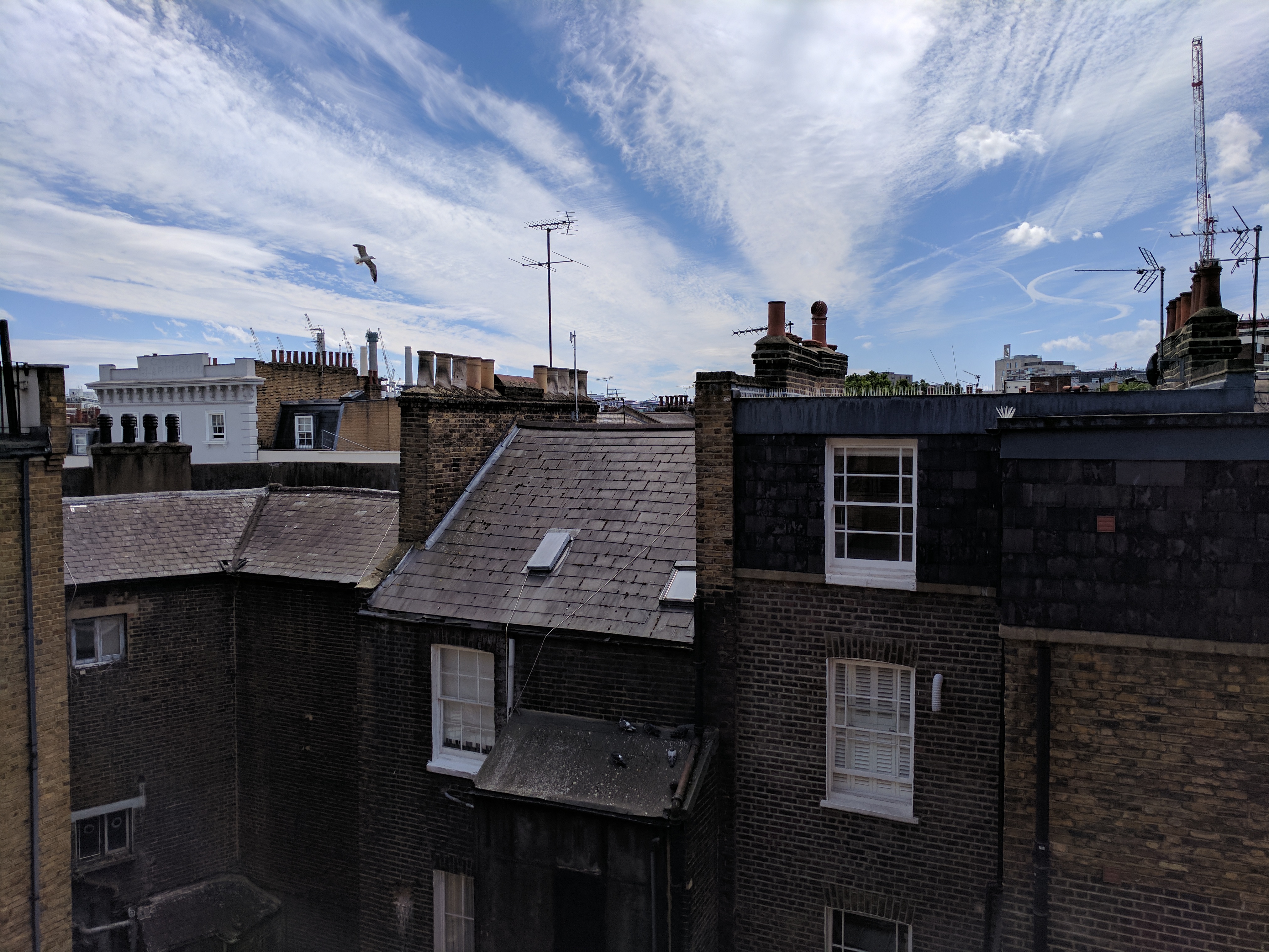Early one morning, the TC (bless her cotton socks) peered out of our hotel window. Across the rooftops of Pimlico, her keen eye spotted the well-known towers of the Battersea Power Station. The seagull’s wing points them out in this picture: