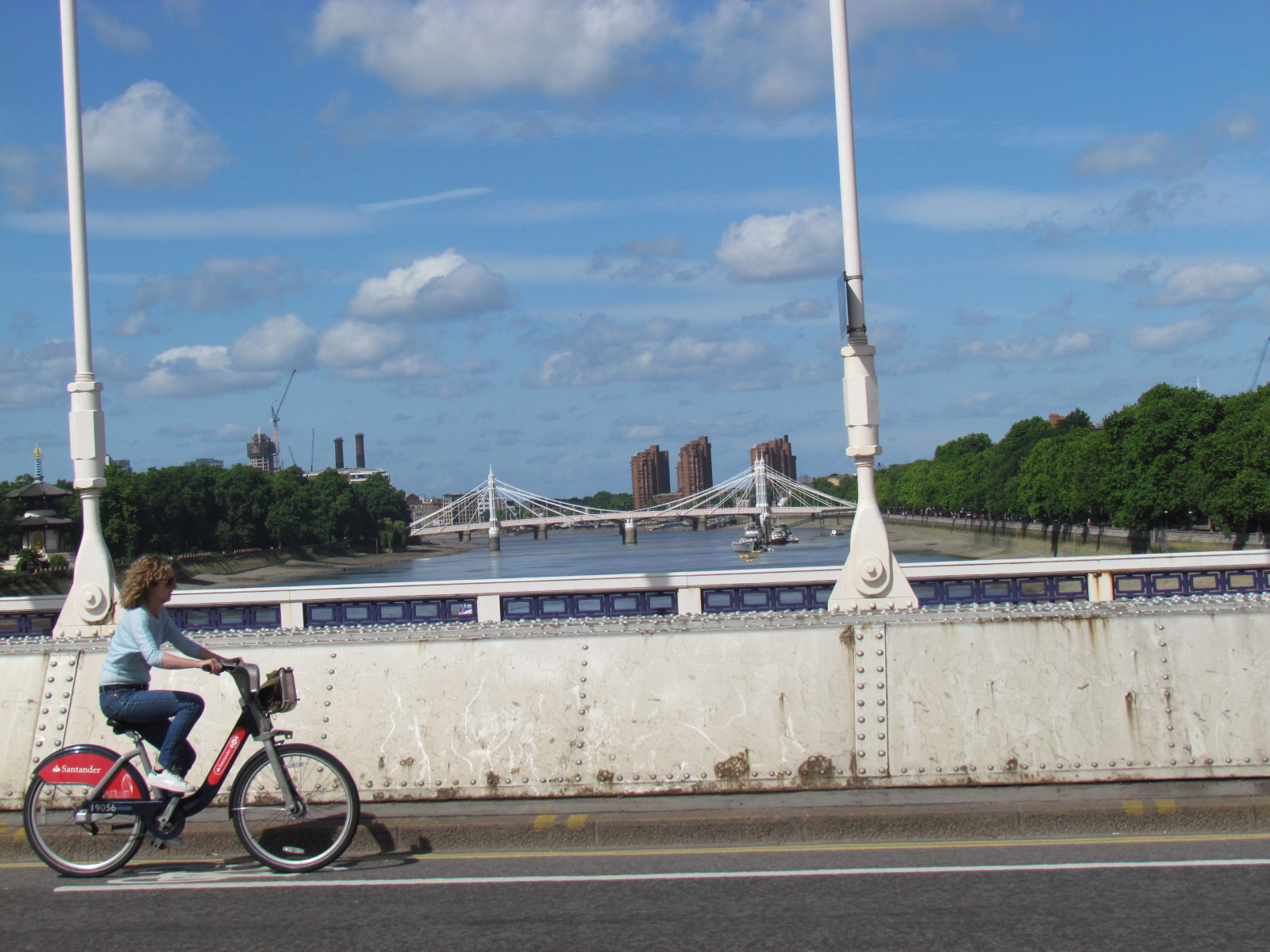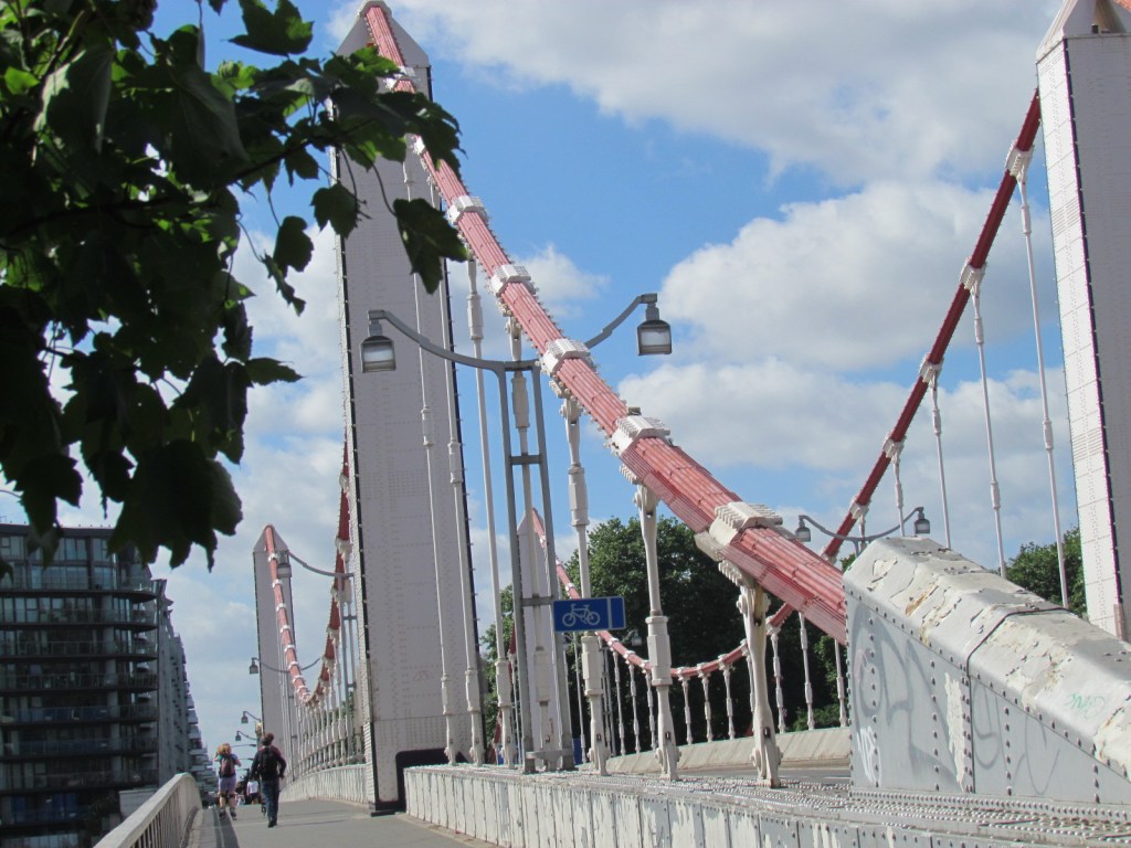 Here’s a view of the old Chelsea Bridge in the distance, seen from the new bridge. The old bridge was built in 1858, and Wikipedia views it as “heavily ornamented”: